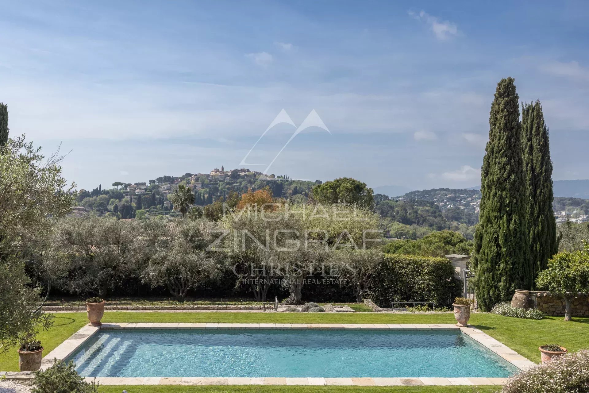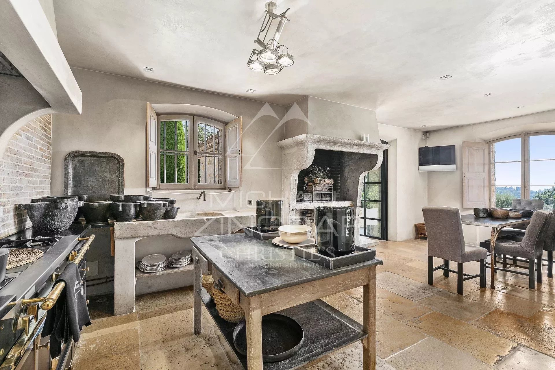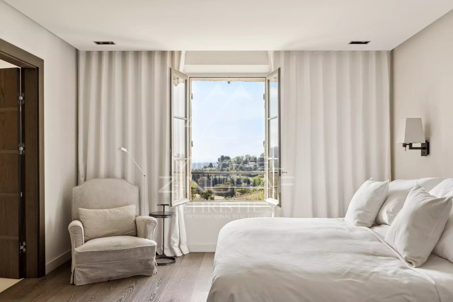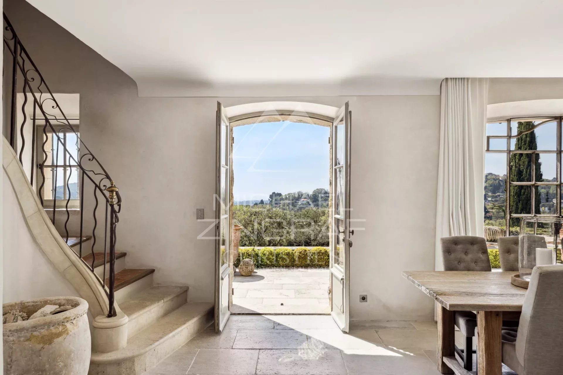 Idéalement située dans le secteur le plus recherché et résidentiel de Mougins, à quelques minutes du vieux village, cette exceptionnelle propriété d'environ 540m2, a été entièrement rénovée et agrandie dans un remarquable mélange de matériaux anciens savamment nichés et de conforts moderne. Bénéficiant d'une époustouflante vue panoramique sur la mer et le village, la maison principale offre de belles et lumineuses pièces de réceptions, 4 belles suites ainsi qu'un salon cinema et une salle de sport. La maison d'amis dispose quant à elle d'un salon, d'une chambre et d'une salle de douche. Au coeur d'un jardin de plus de 5000 m2 aux restanques en pierres sèches complantées de nombreux oliviers, et lavandes, la propriété comprend également une piscine et un abri pour 3 voitures.