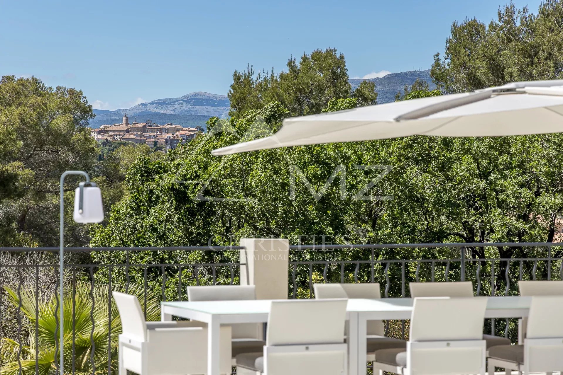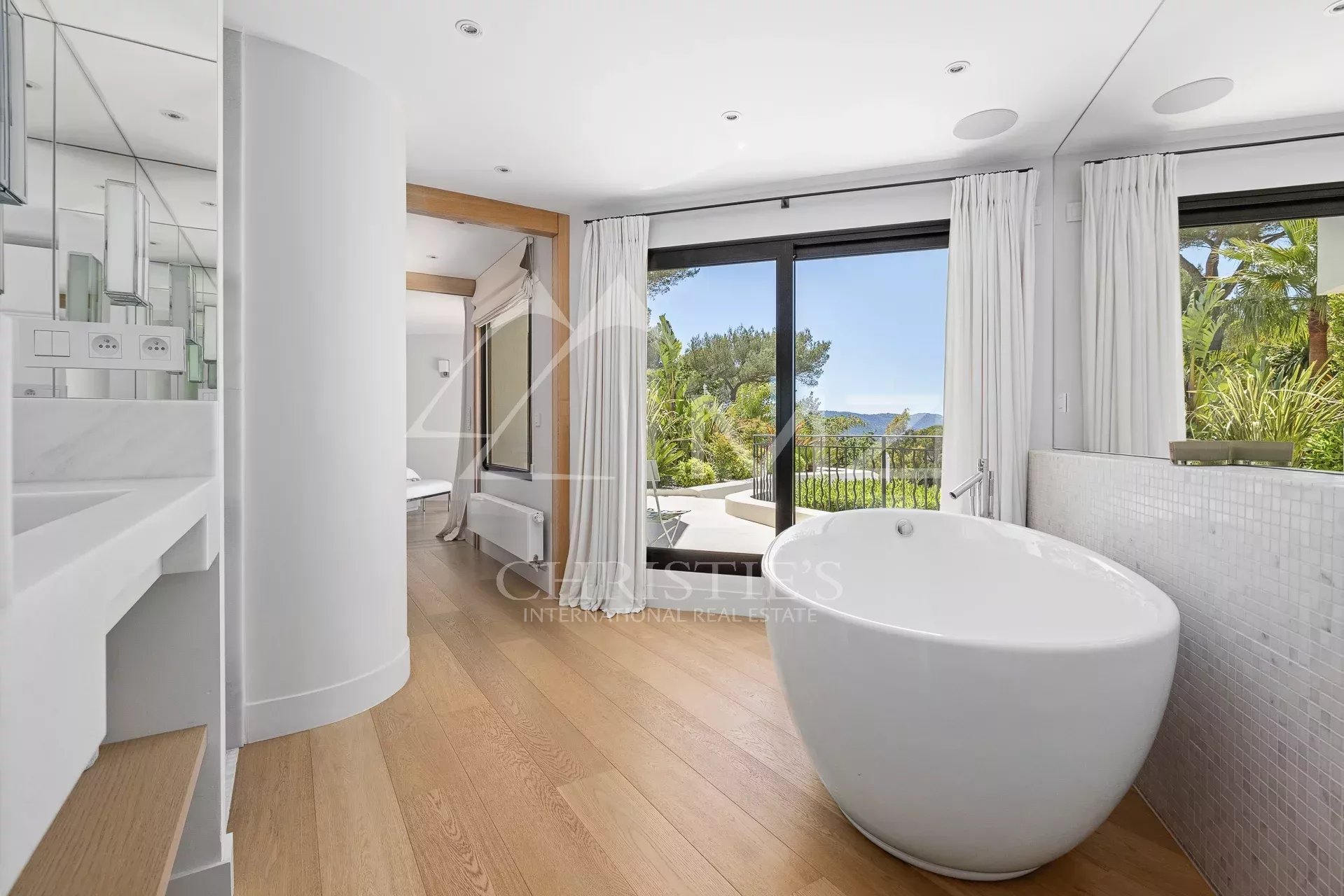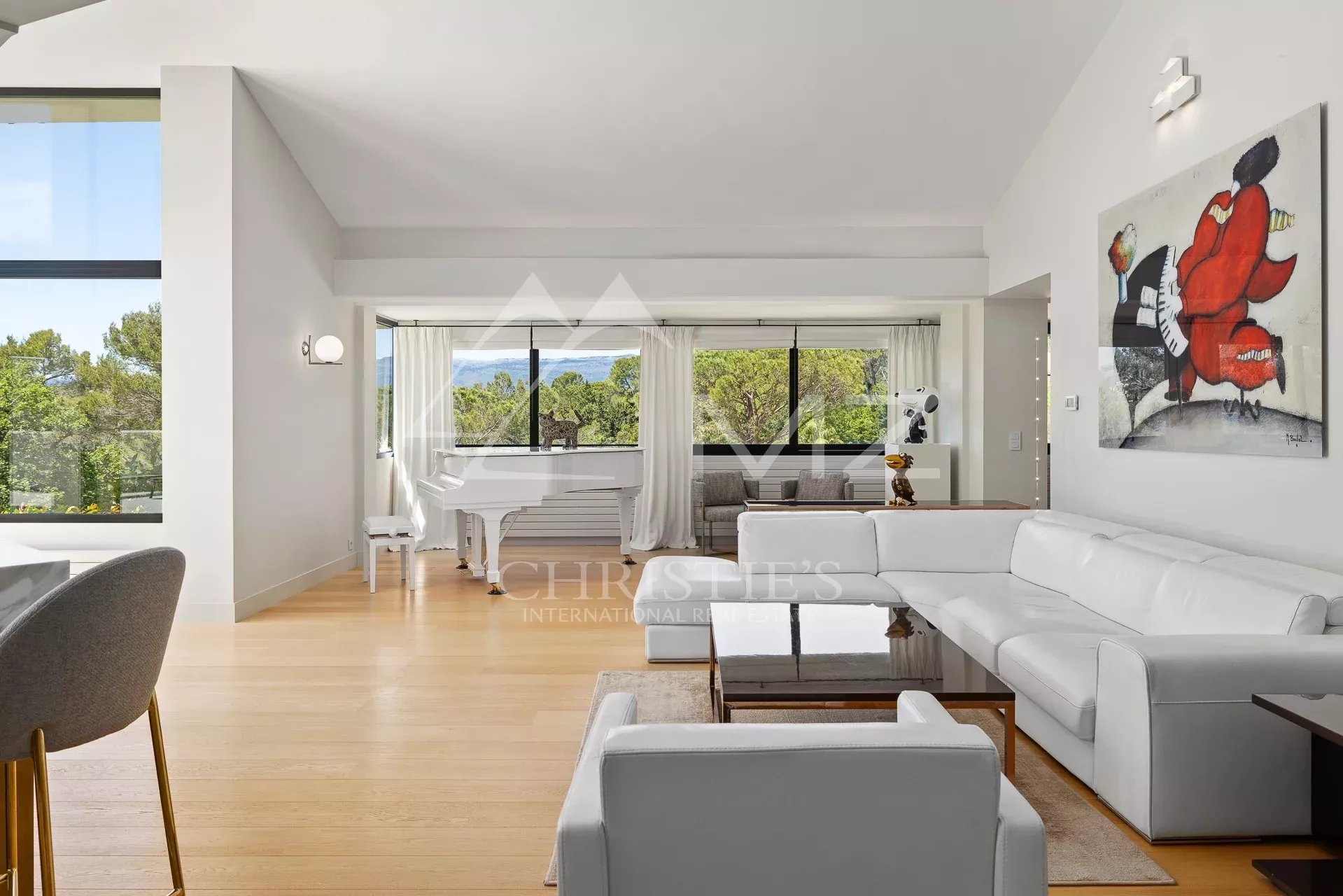 Située dans un domaine privé, dans un quartier calme et résidentiel, cette villa de 450m² à la position dominante offre 5 chambres doubles et 5 salles de bain/douche en suite, avec une vue dégagée sur les collines environnantes et le village de Mougins. Rénovée avec goût et offrant des prestations haut de gamme, cette propriété propose également de nombreux espaces de détente intérieur et extérieur avec une triple réception ouvrant sur la piscine et ses nombreuses terrasses aménagées. Piscine chauffée au sel de 17m. Pool house avec bar, douche et toilettes.