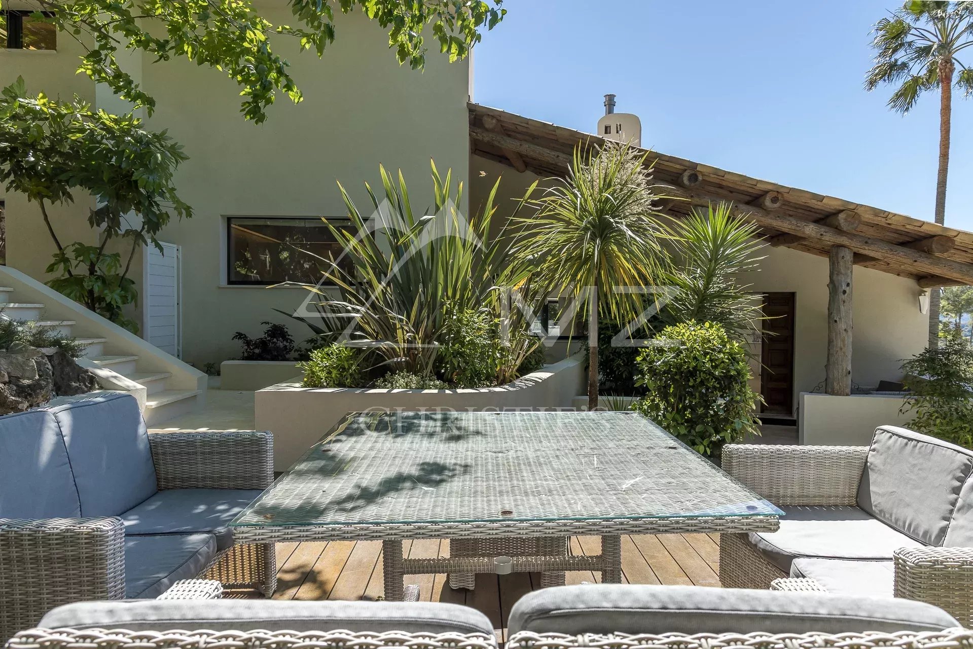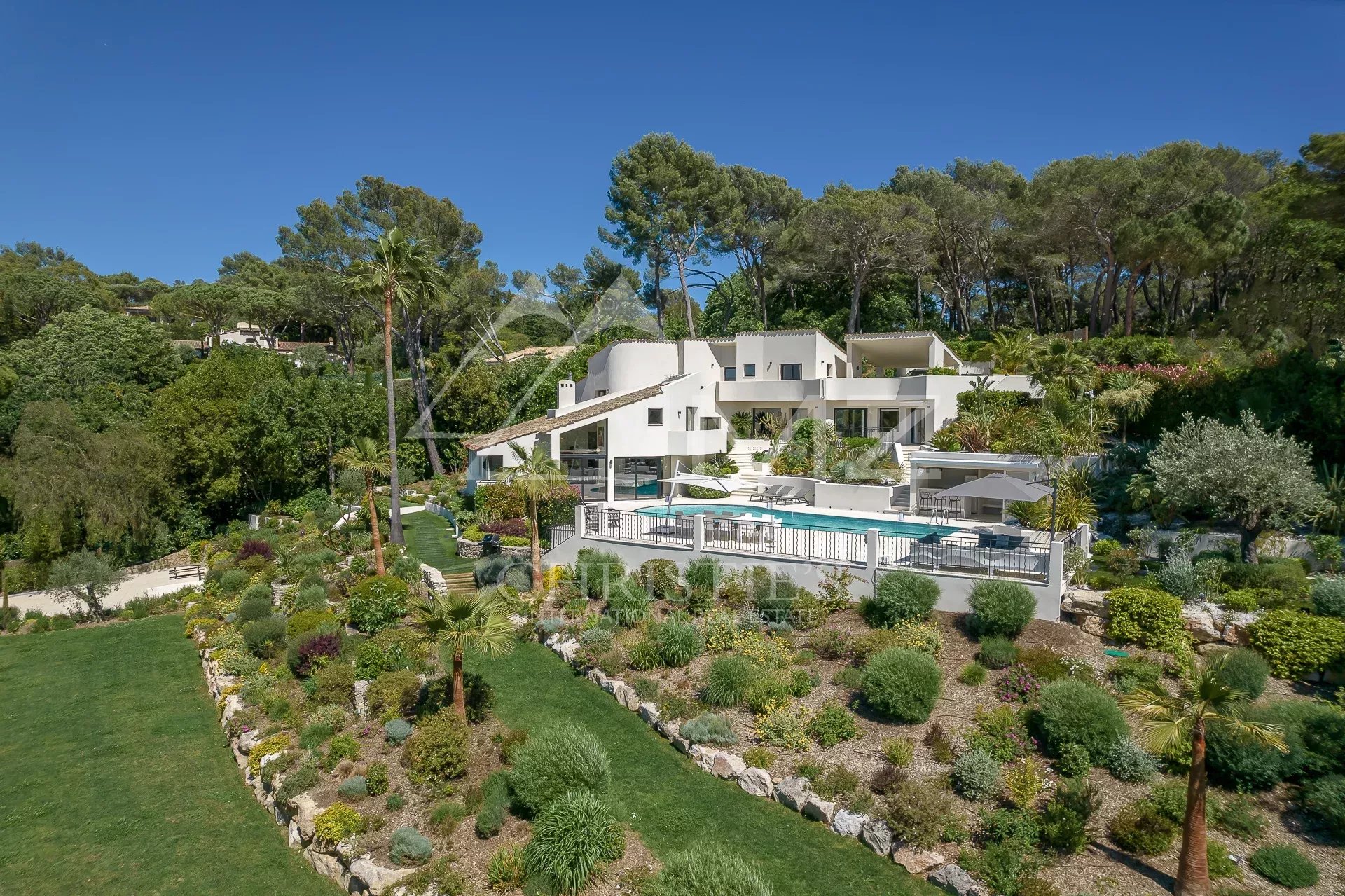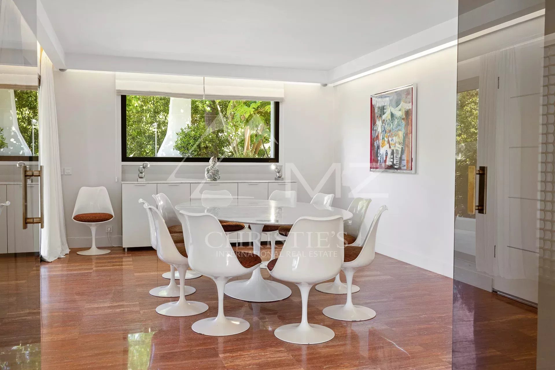 Située dans un domaine privé, dans un quartier calme et résidentiel, cette villa de 450m² à la position dominante offre 5 chambres doubles et 5 salles de bain/douche en suite, avec une vue dégagée sur les collines environnantes et le village de Mougins. Rénovée avec goût et offrant des prestations haut de gamme, cette propriété propose également de nombreux espaces de détente intérieur et extérieur avec une triple réception ouvrant sur la piscine et ses nombreuses terrasses aménagées. Piscine chauffée au sel de 17m. Pool house avec bar, douche et toilettes.