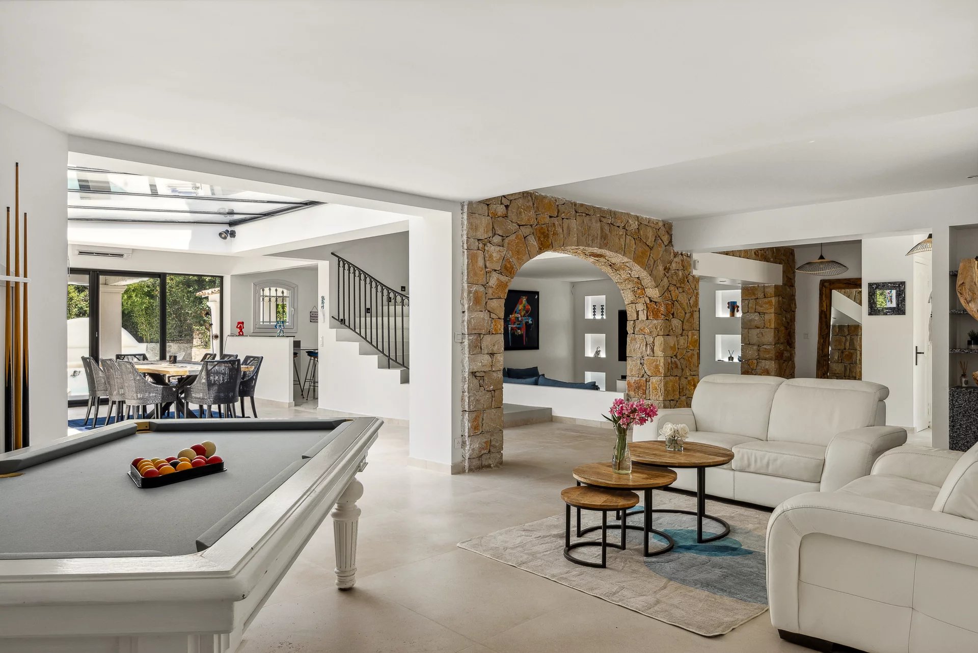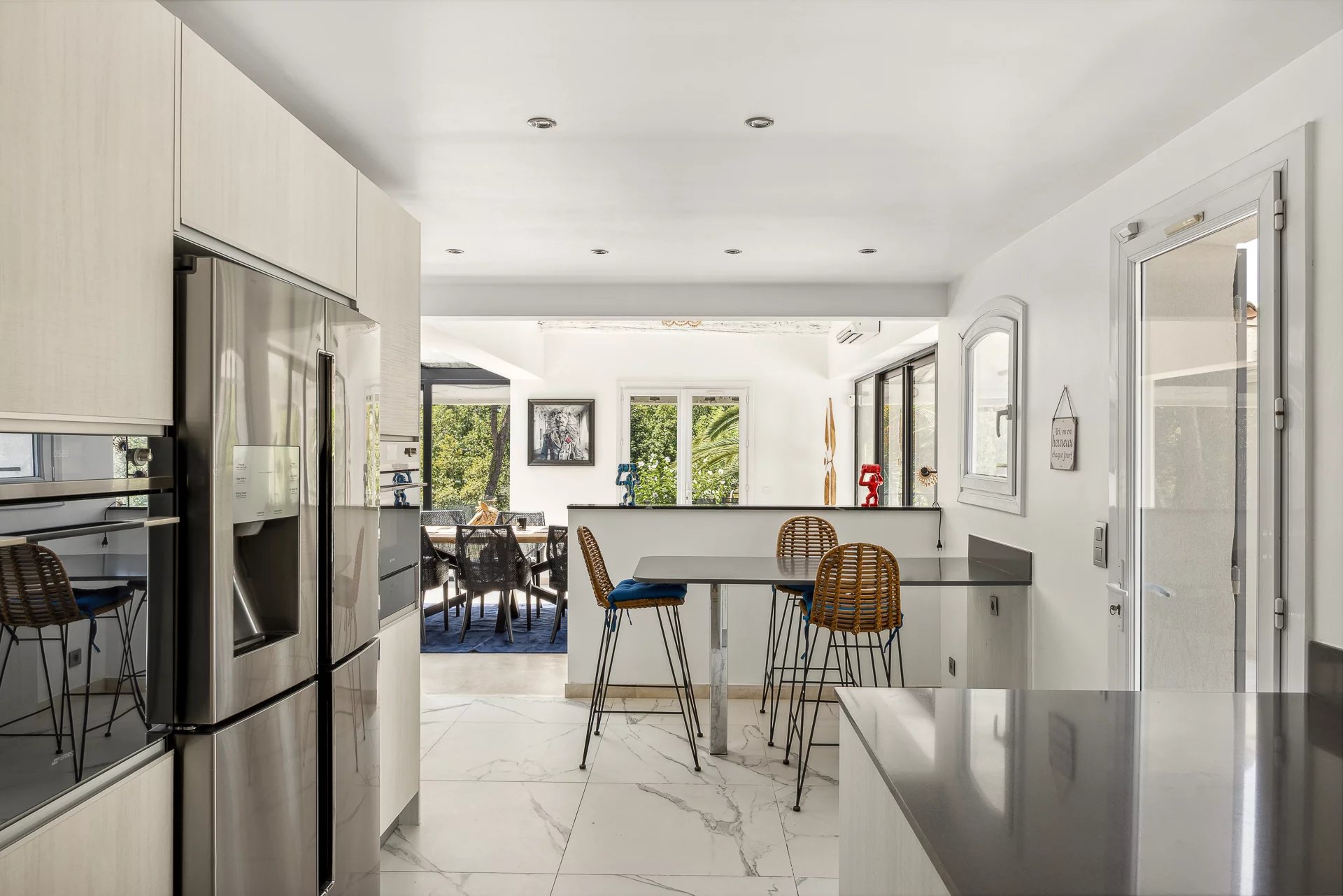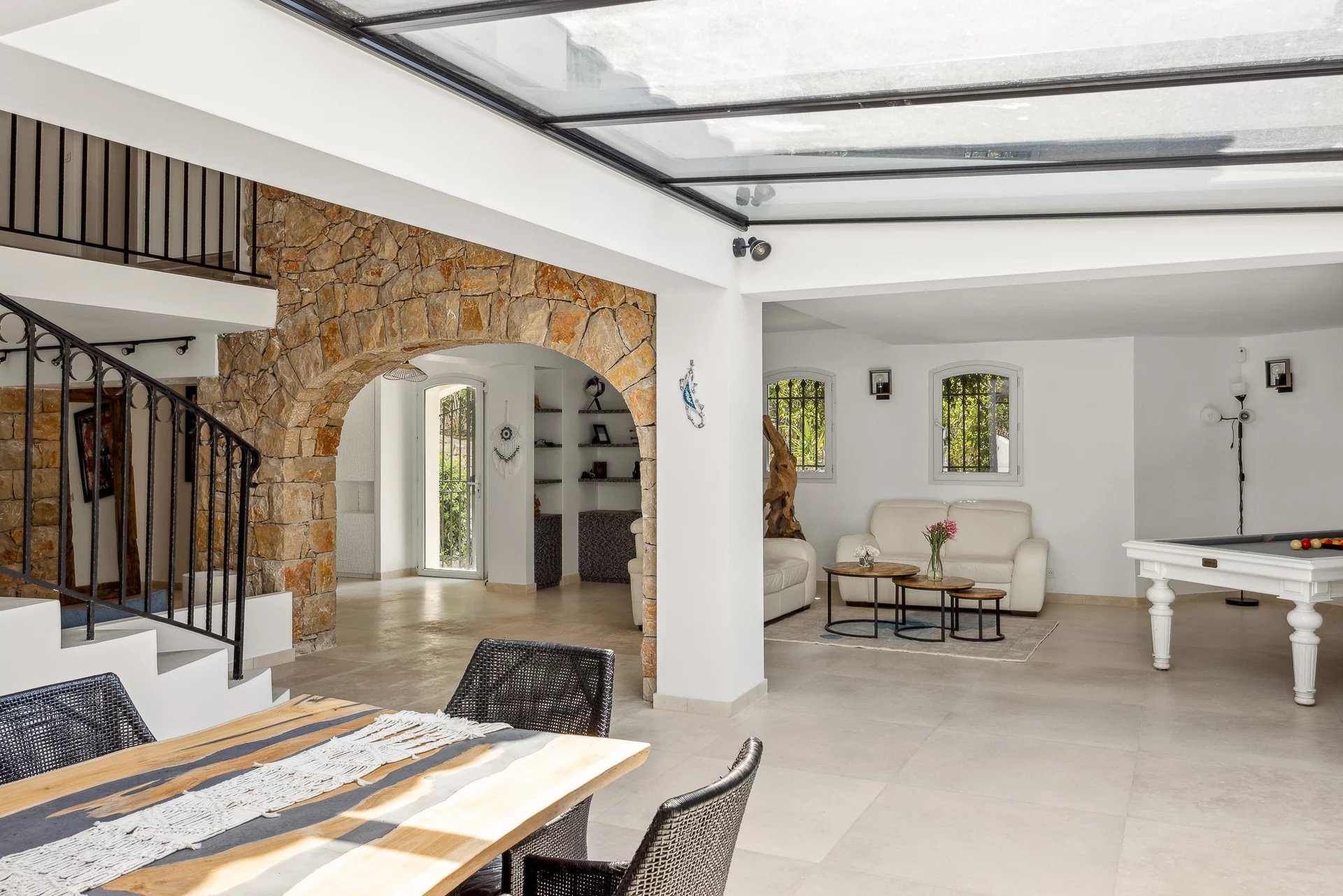 Aux portes de Cannes, cette villa récemment rénovée d'environ 260m² bénéfice d'une superbe vue sur le vieux village de Mougins.