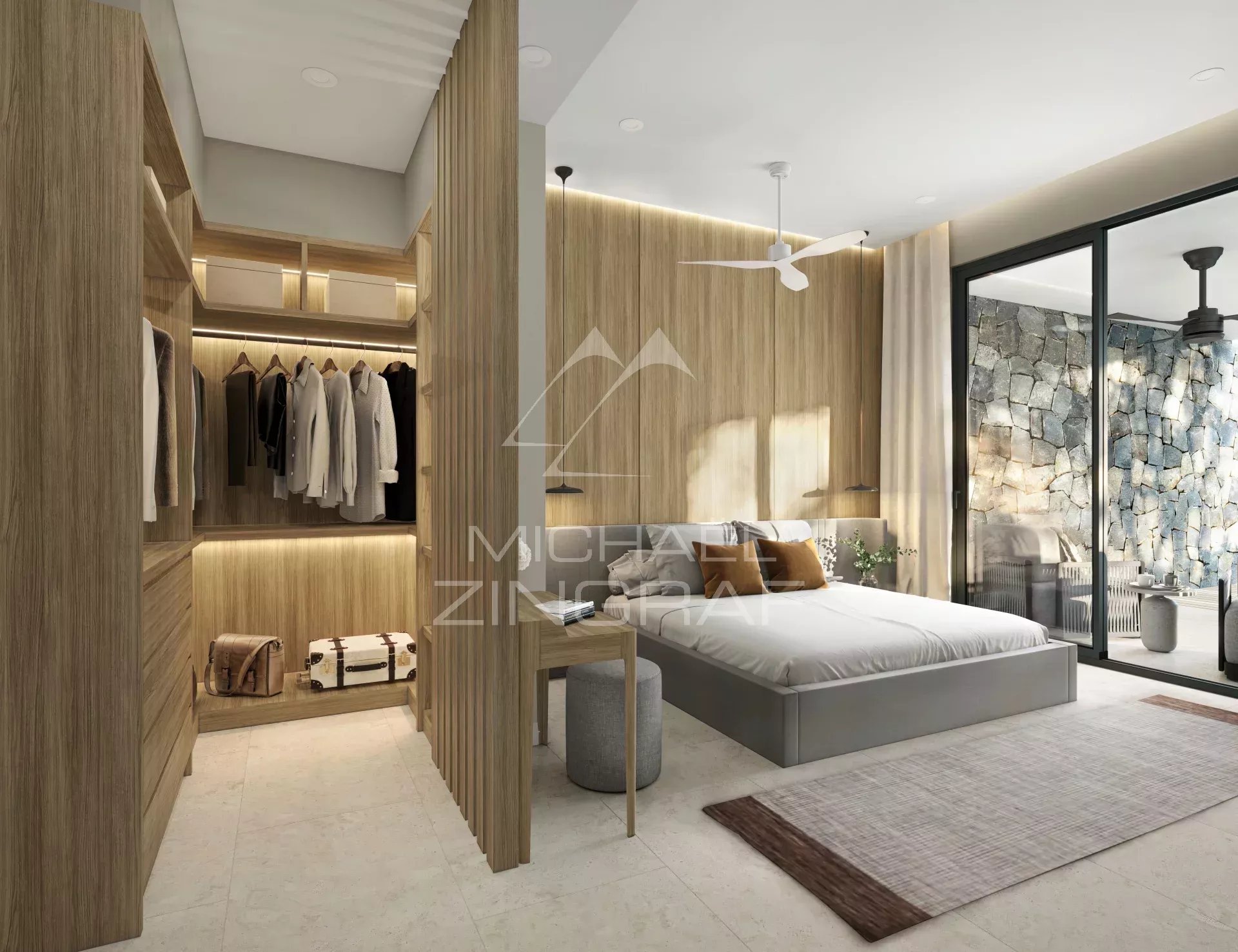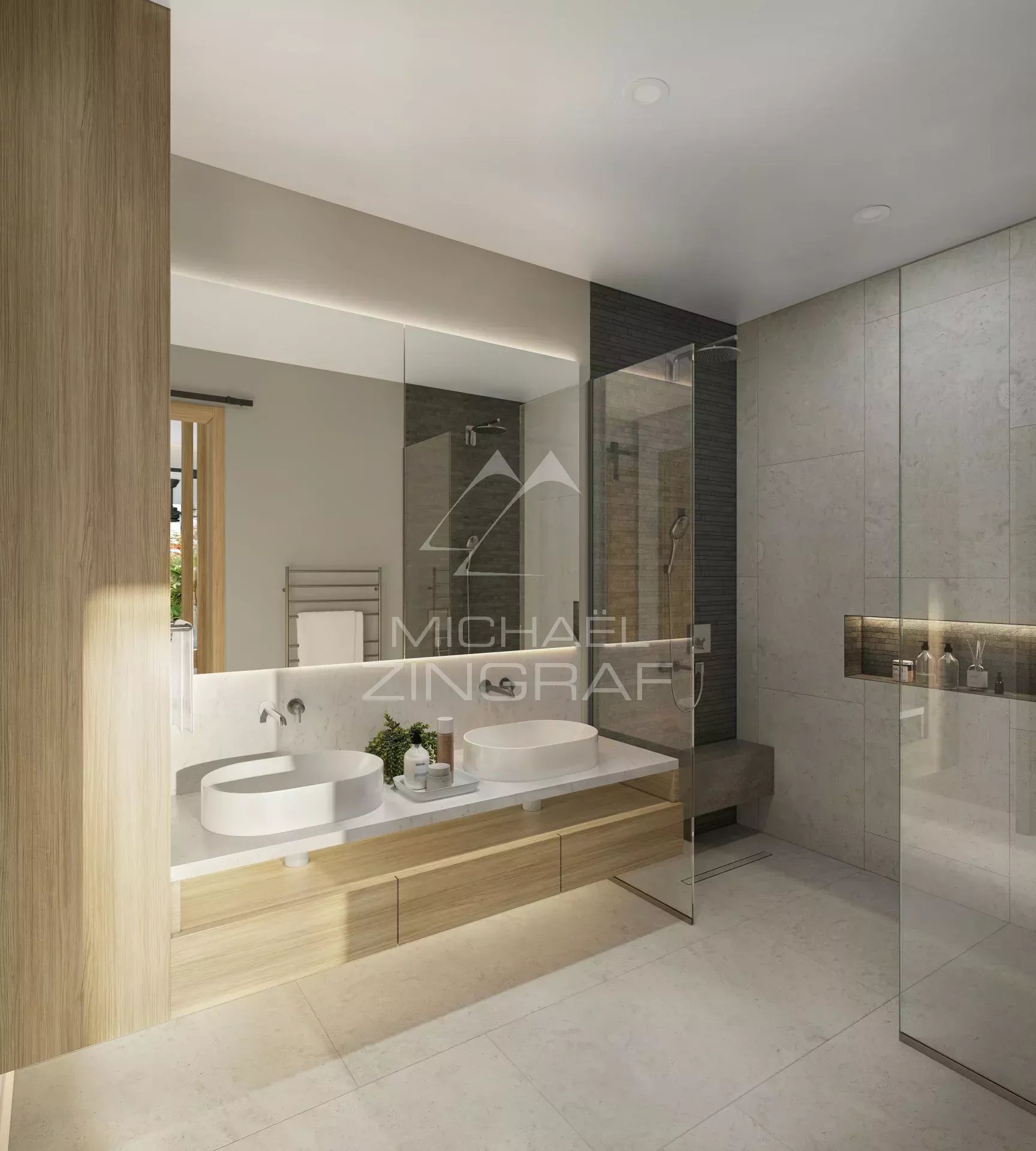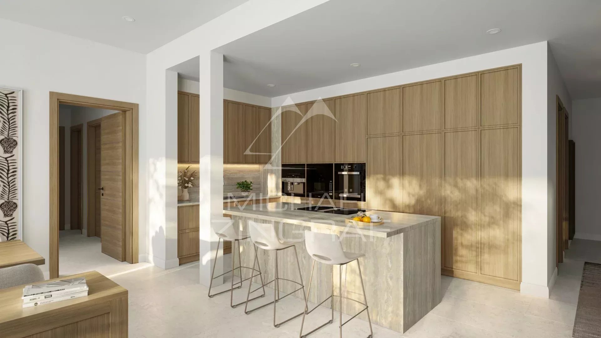 Un hall majestueux révèle des volumes sculpturaux et un escalier suspendu dansant avec la lumière. En son centre, un olivier offre un point d’ancrage serein — symbole de longévité et d’harmonie. Plus qu’un passage, une déclaration de sophistication apaisée.