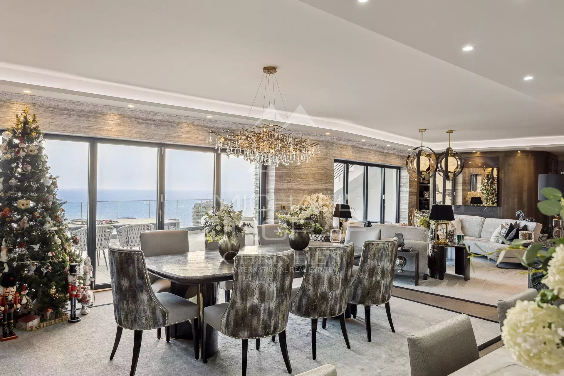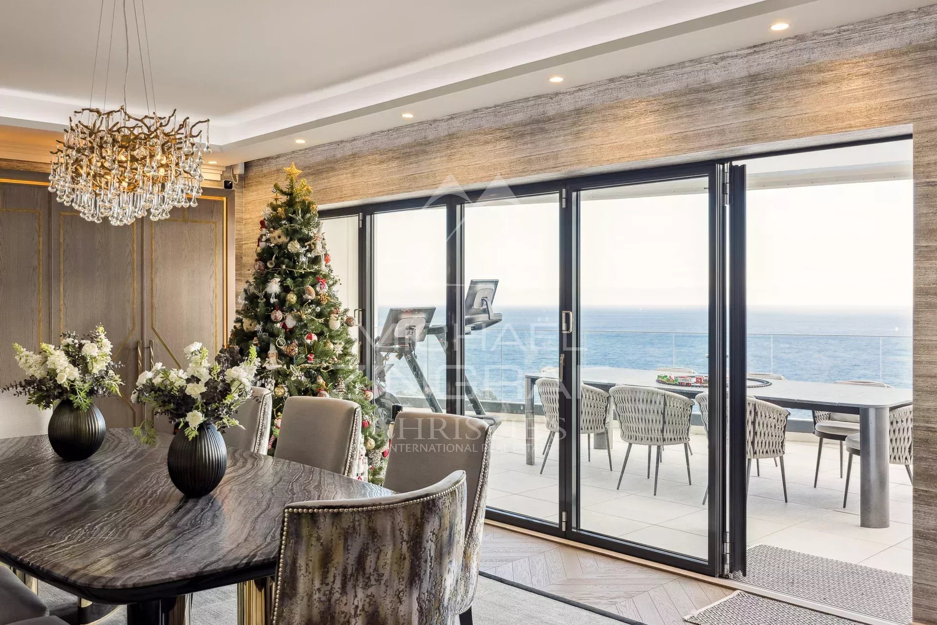 Ce sublime appartement d'environ 209 m2, avec un solarium en toit terrasse de 320m2, avec jardin et très grand jacuzzi, dispose d'un séjour lumineux, réception et salon ouvrant sur une grande terrasse avec une exceptionnelle vue mer et sur Monaco, et une cuisine entièrement équipée et aménagée avec goût. L’espace nuit comprend trois chambres, dont deux ouvrant sur la terrasse, avec chacune leurs salles de bains/douche.