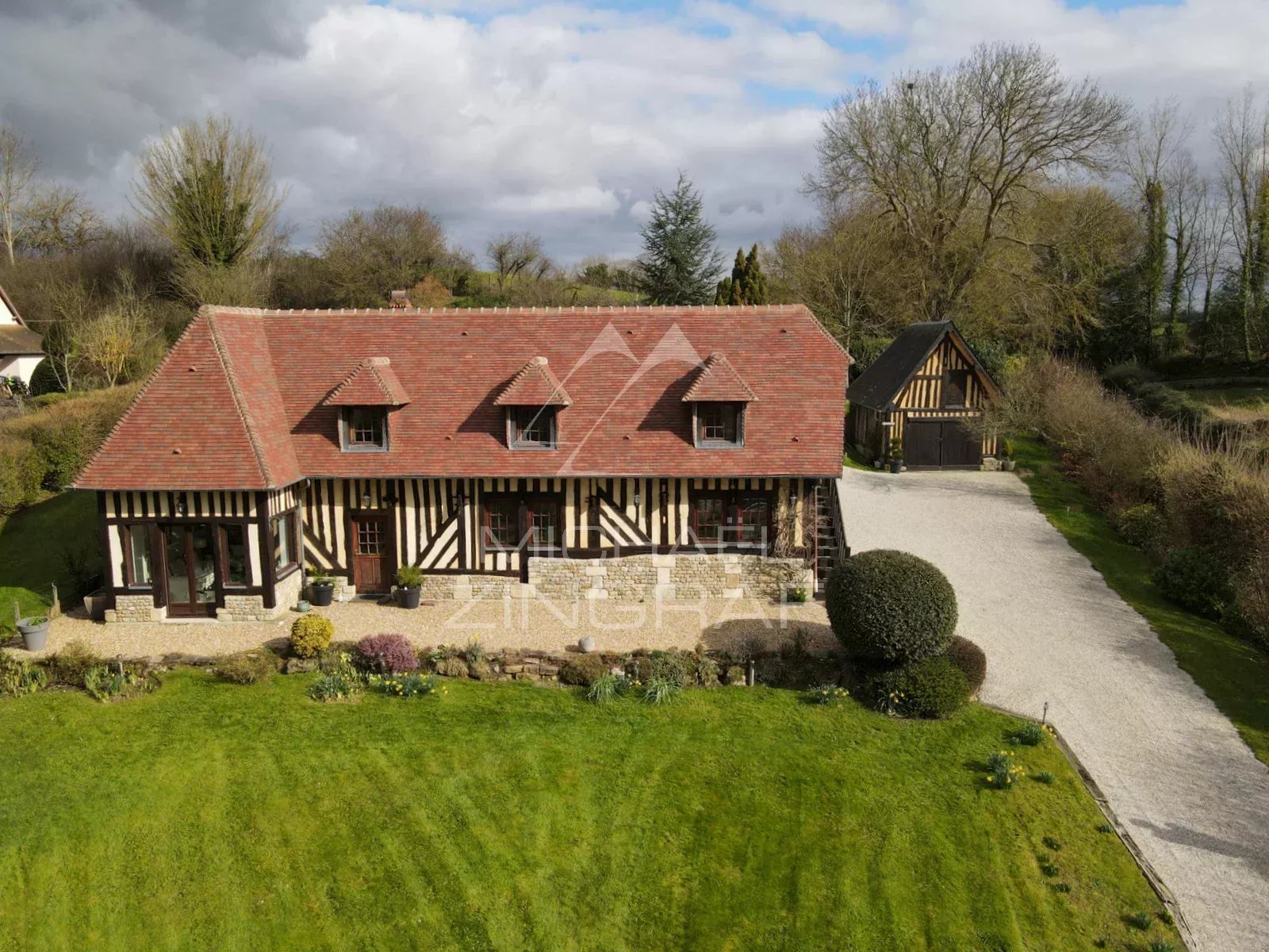 En Normandie, à seulement 15 minutes de la mer et dans l’un des « Plus beaux villages de France », ravissante propriété de style Augeron édifiée en position dominante avec une vue dégagée.