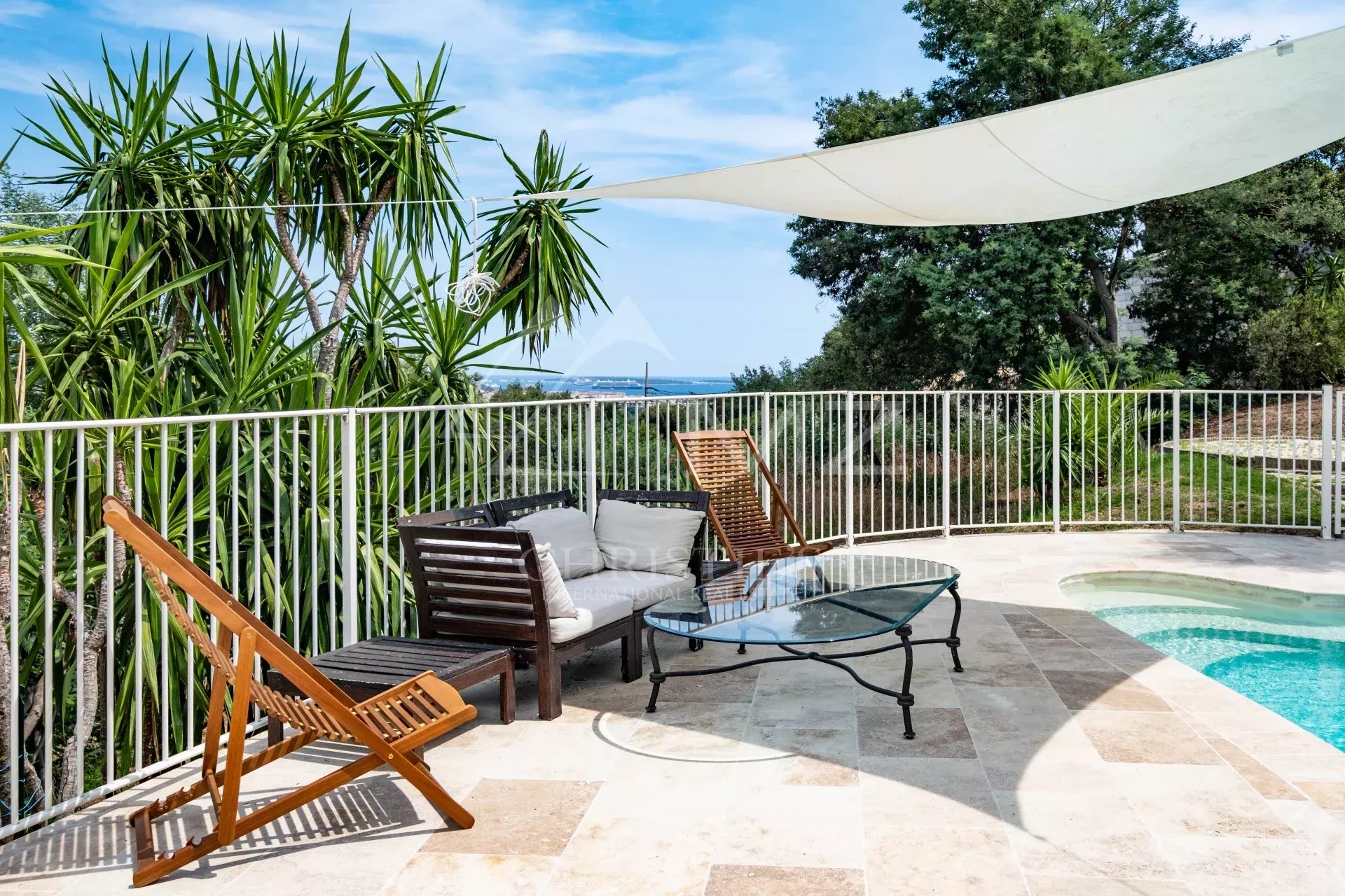 Magnifique villa contemporaine de style Californien d'environ 260 m2 bénéficiant d'un ensoleillement total et offrant une vue mer panoramique à 270 degrés sur le Massif de l'Estérel, la baie de Cannes et les îles de Lérins. Sur un terrain en pente d'environ 2 561 m2, aménagé en trois larges terrasses.