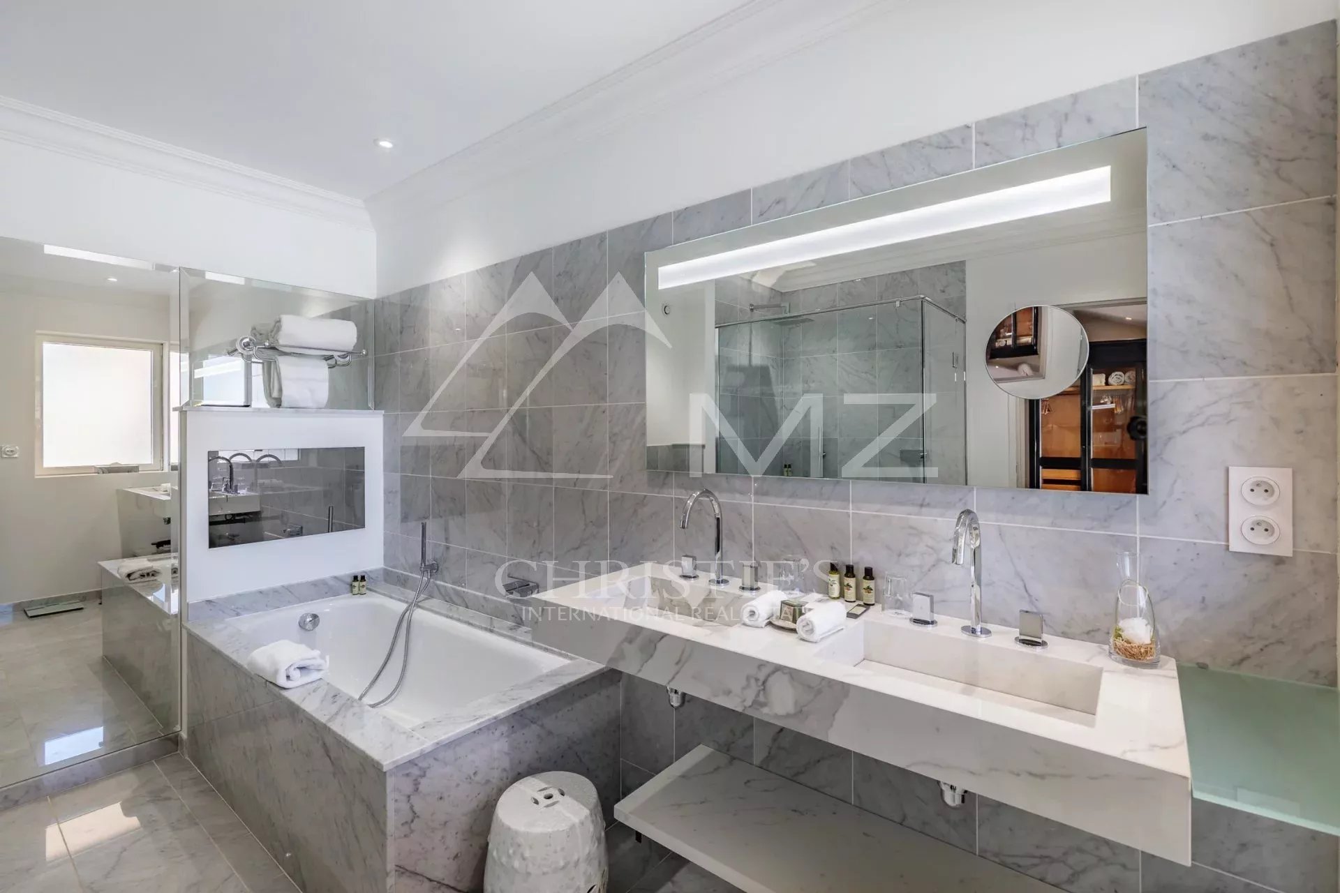 La villa de 550 m² environ, luxueuse et rare, offre le must en termes d’intimité extrême et de personnalisation ultime. Le rêve de se sentir comme chez soi en profitant de prestations haut de gamme. Cette spacieuse maison est équipée de 7 chambres et suites climatisées, pouvant accueillir jusqu'à 15 personnes. De grands salons avec cheminées, d’une cuisine totalement équipée, de vastes terrasses, d’un parc de 7000 m² gardé, privé et arboré d’essences provençales bercées par le chant des cigales. Une piscine chauffée de 12 x 6 mètres totalement sécurisée à traitement ultraviolet à l’eau de la source (sans chlore), d’une salle de fitness et d’un terrain de pétanque. Majordome, gouvernante et chef de cuisine accompagnent la vie de la Villa tout au long du séjour, si tel est votre désir.