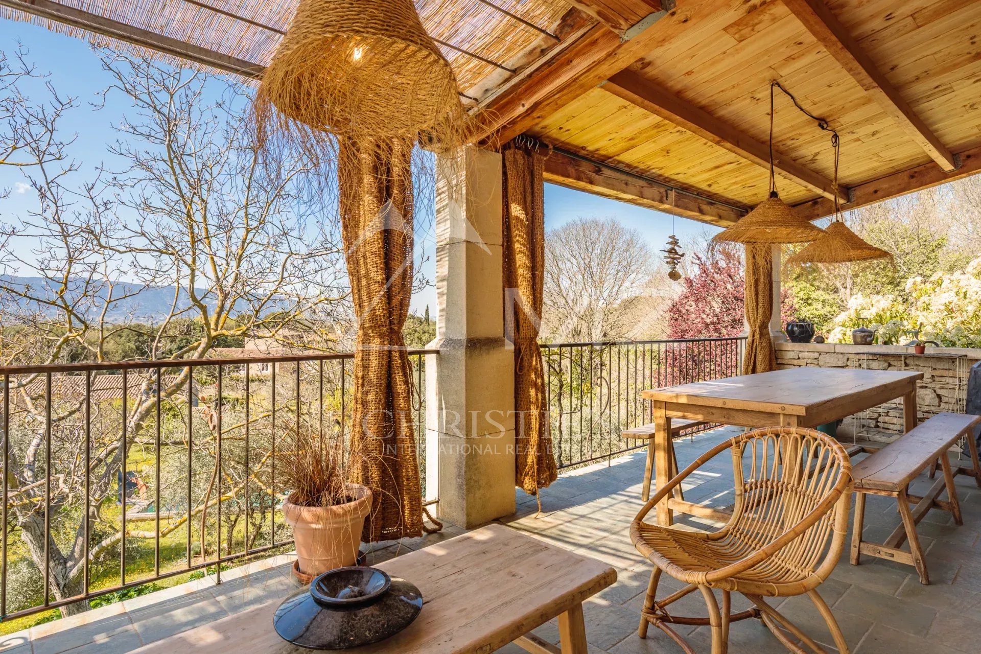 A quelques minutes du village emblématique de Gordes, cette magnifique maison en pierre offre une vue panoramique sur le Luberon.