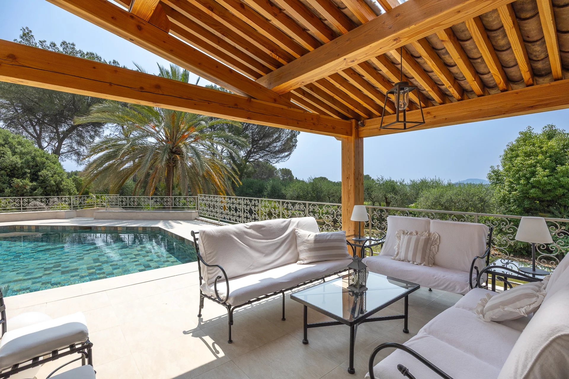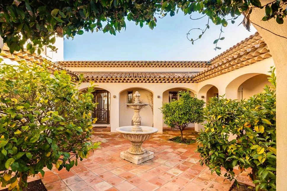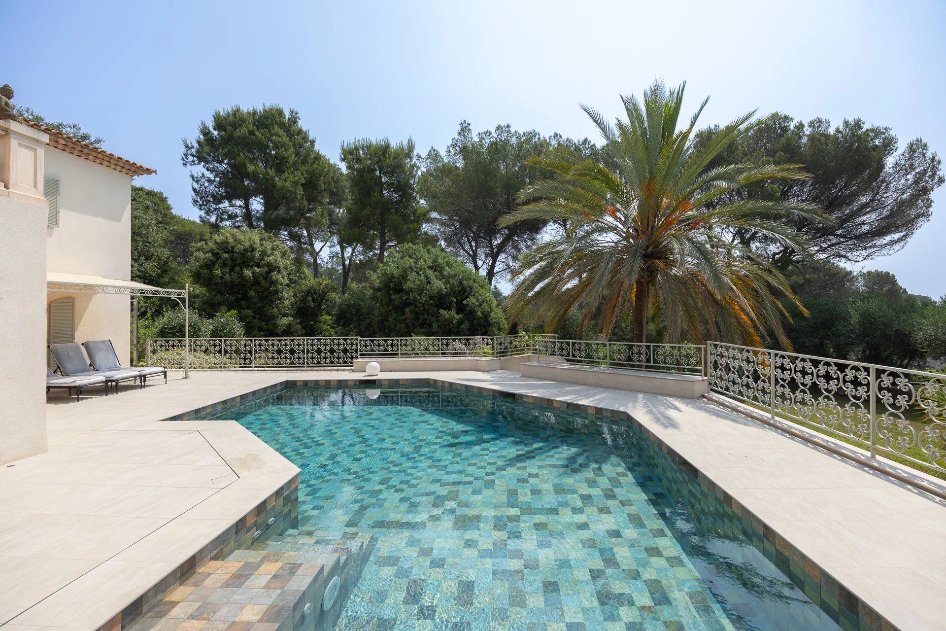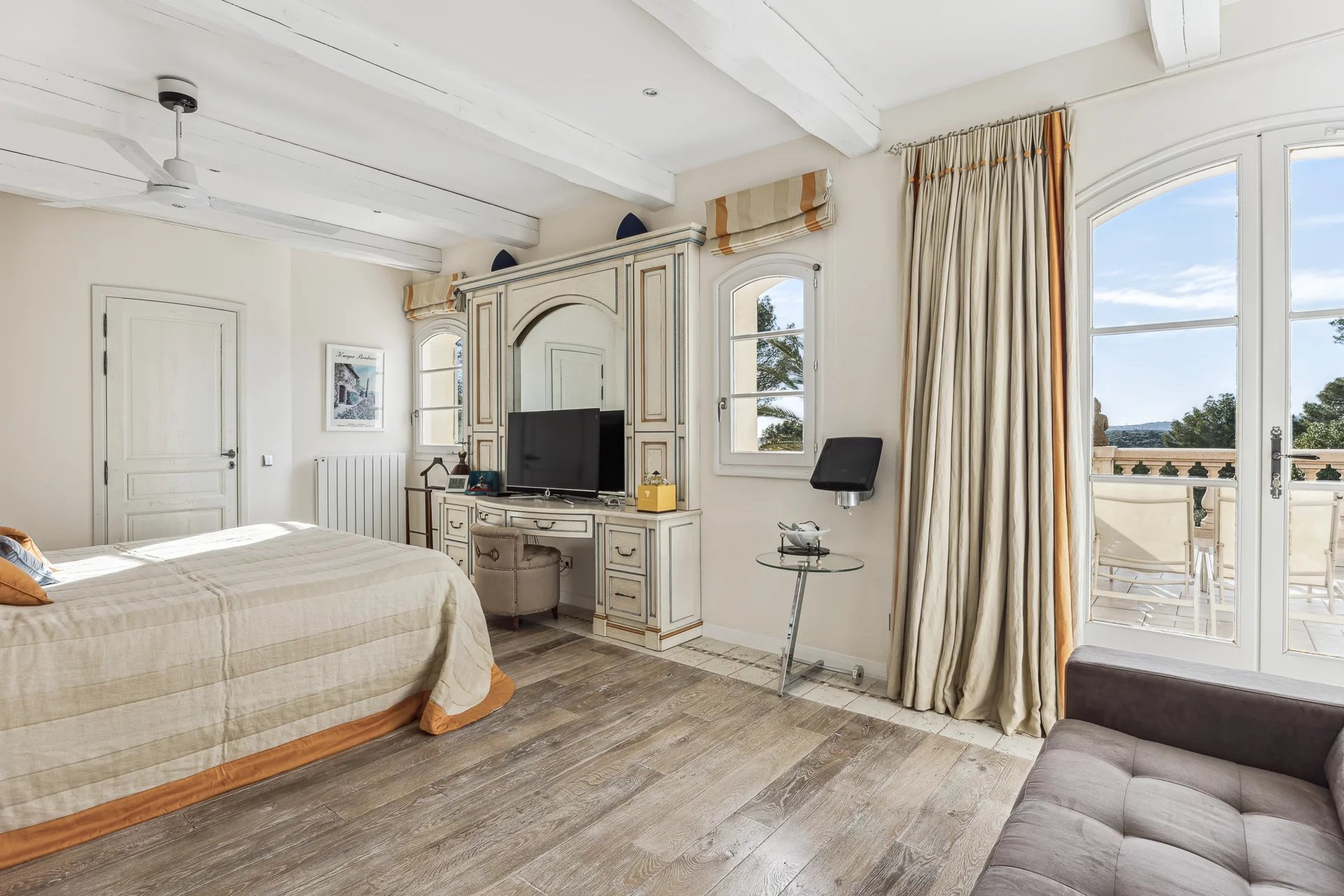 La villa propose des espaces généreux : un salon avec cheminée, une cuisine équipée, six chambres en suite, une terrasse avec piscine et un espace loisirs comprenant salle de sport, spa, cinéma et cave à vins.