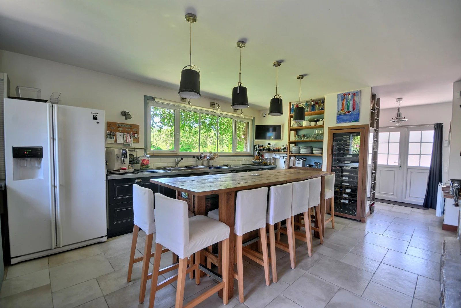La maison principale d’une surface de plus de 200 m2 présente au rez-de-chaussée une entrée, une cuisine aménagée et équipée avec un accès direct sur le jardin, un salon d’hiver et une bibliothèque avec cheminée à double foyer, une salle à manger et un grand salon d’été avec de grandes baies vitrées ouvertes sur le jardin. L’ensemble est prolongé par de nombreuses terrasses.