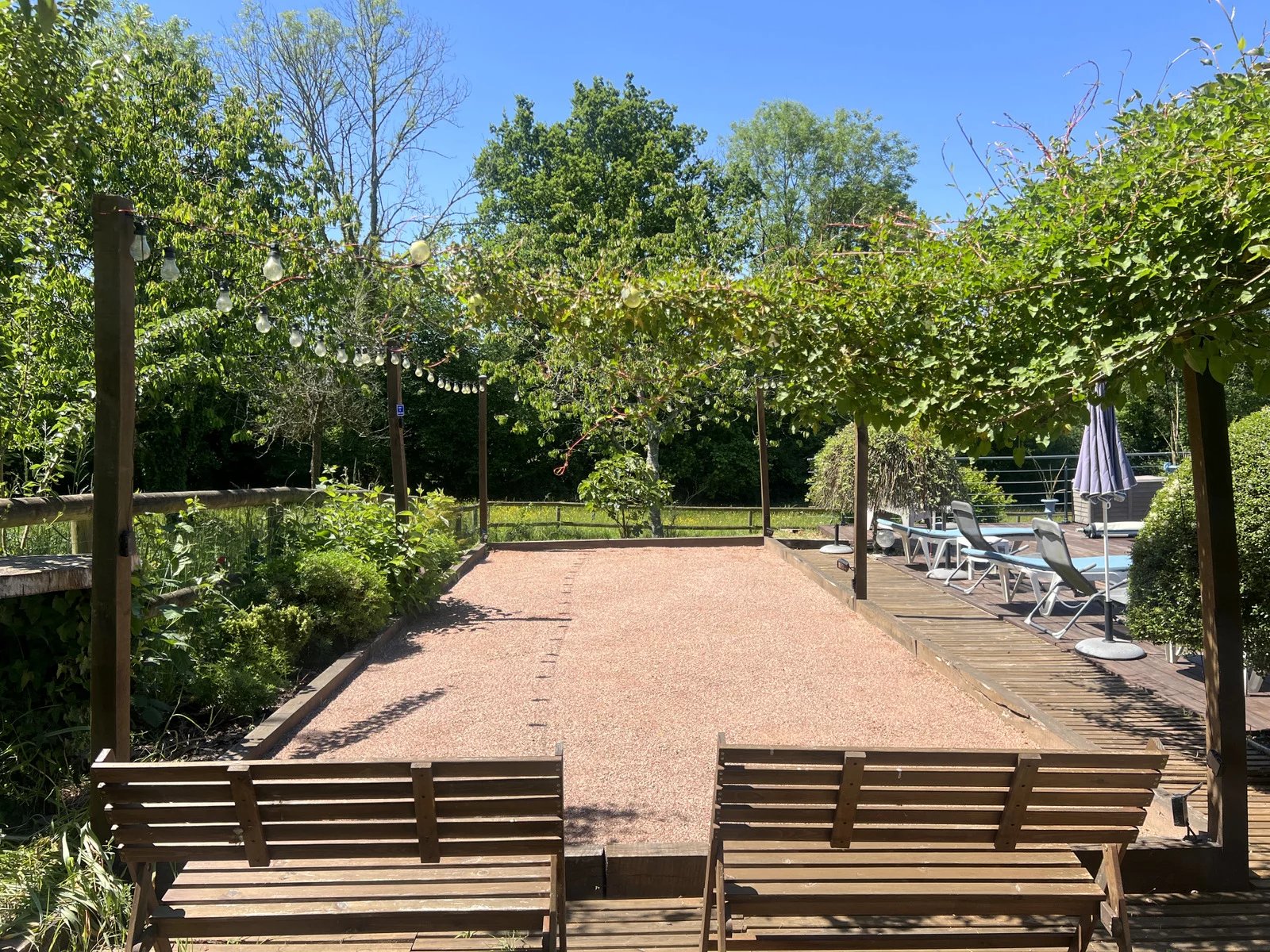 Le jardin particulièrement arboré et fleuri est aménagé ; il comprend des terrasses, une piscine chauffée agrémentée d’un salon d’été avec bar, un jacuzzi, une salle de sport, un boulodrome, une gloriette et deux paddocks.