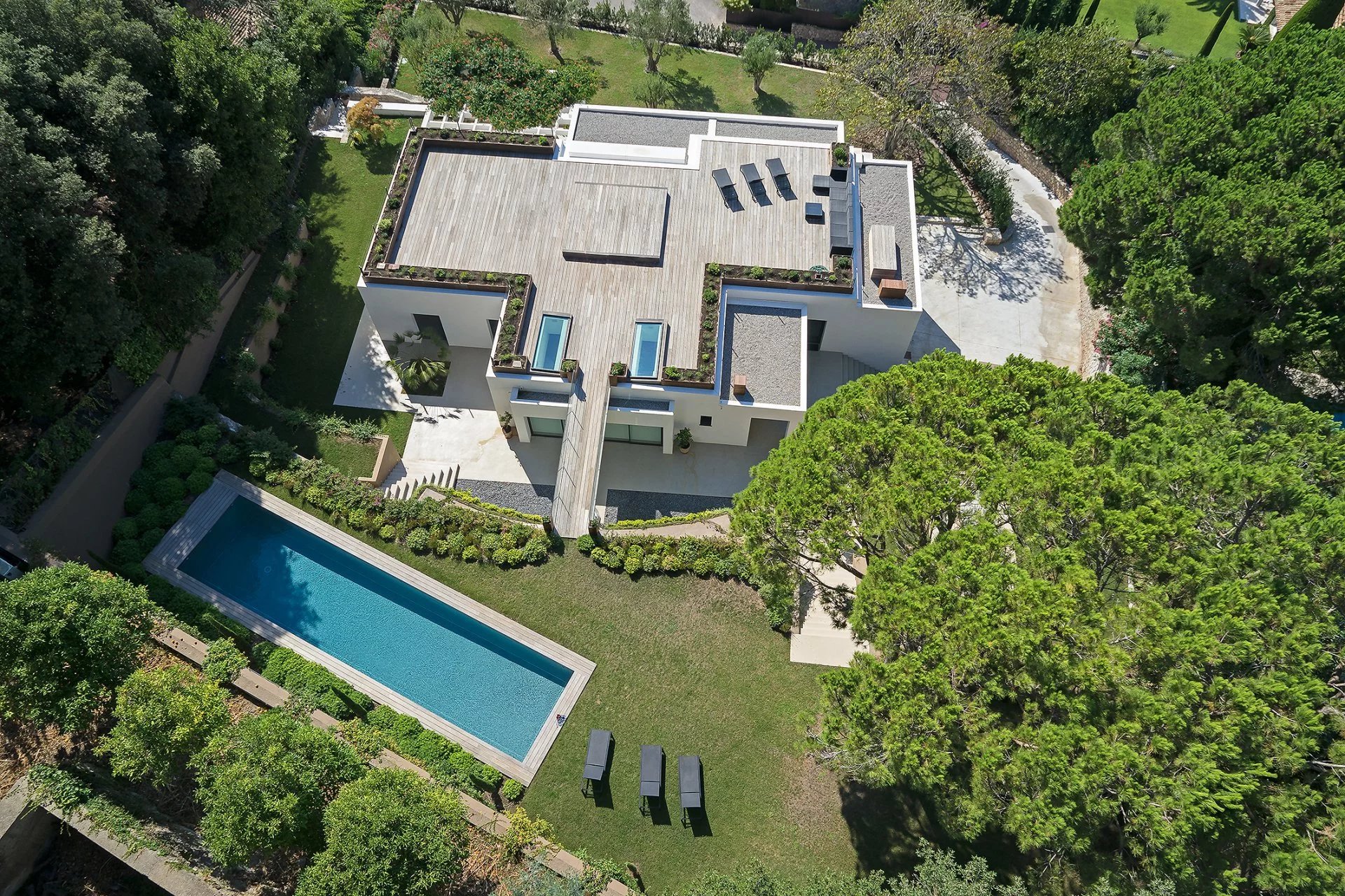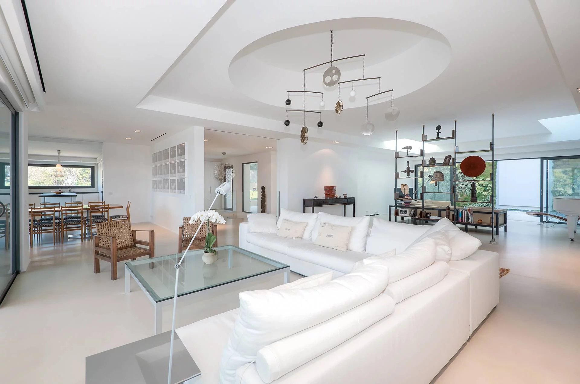 Au calme absolu et seulement à 5 minutes de la Croisette villa contemporaine d’environ 500 m² comprenant : au rez de chaussée, un salon, un séjour, une cuisine, une chambre...