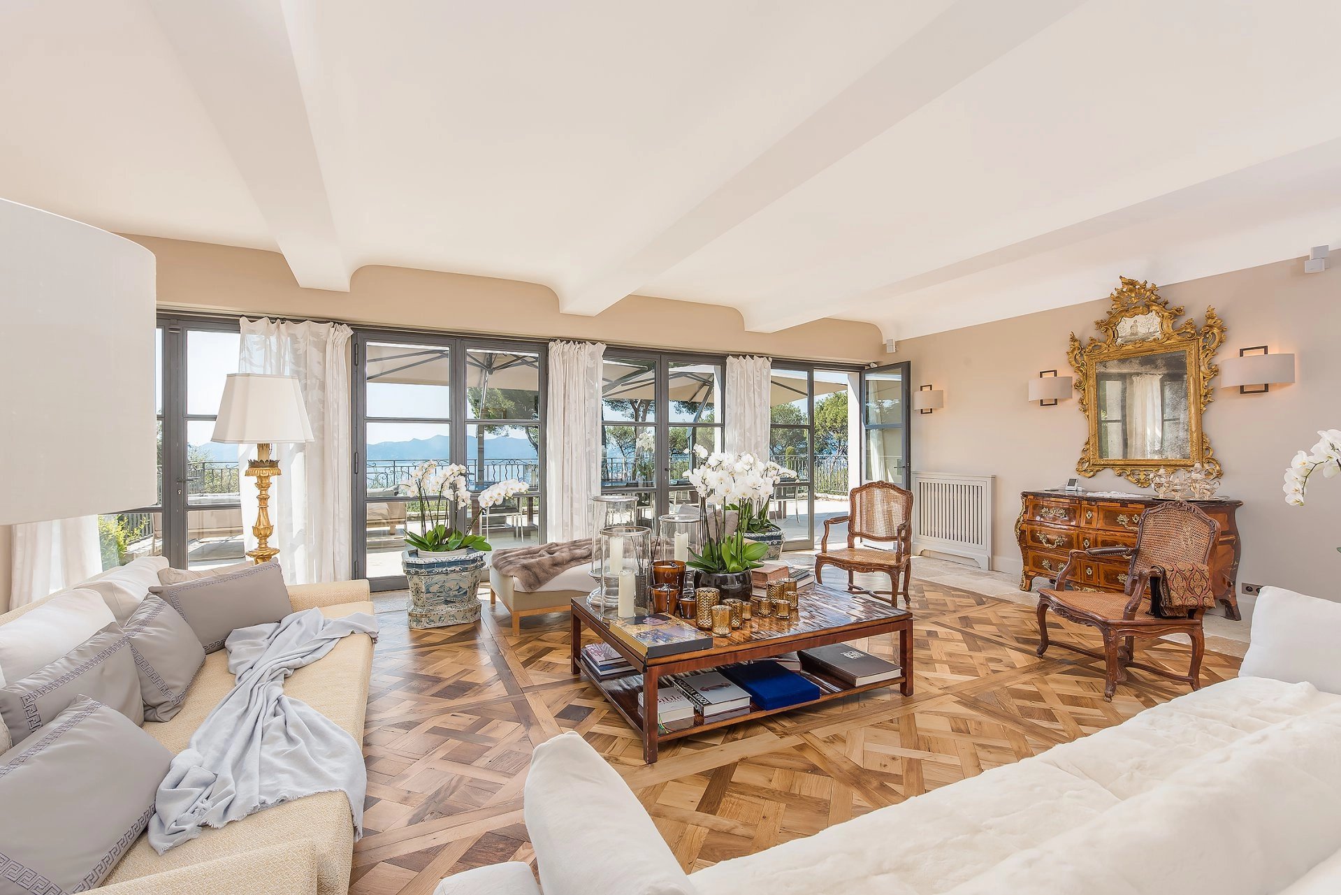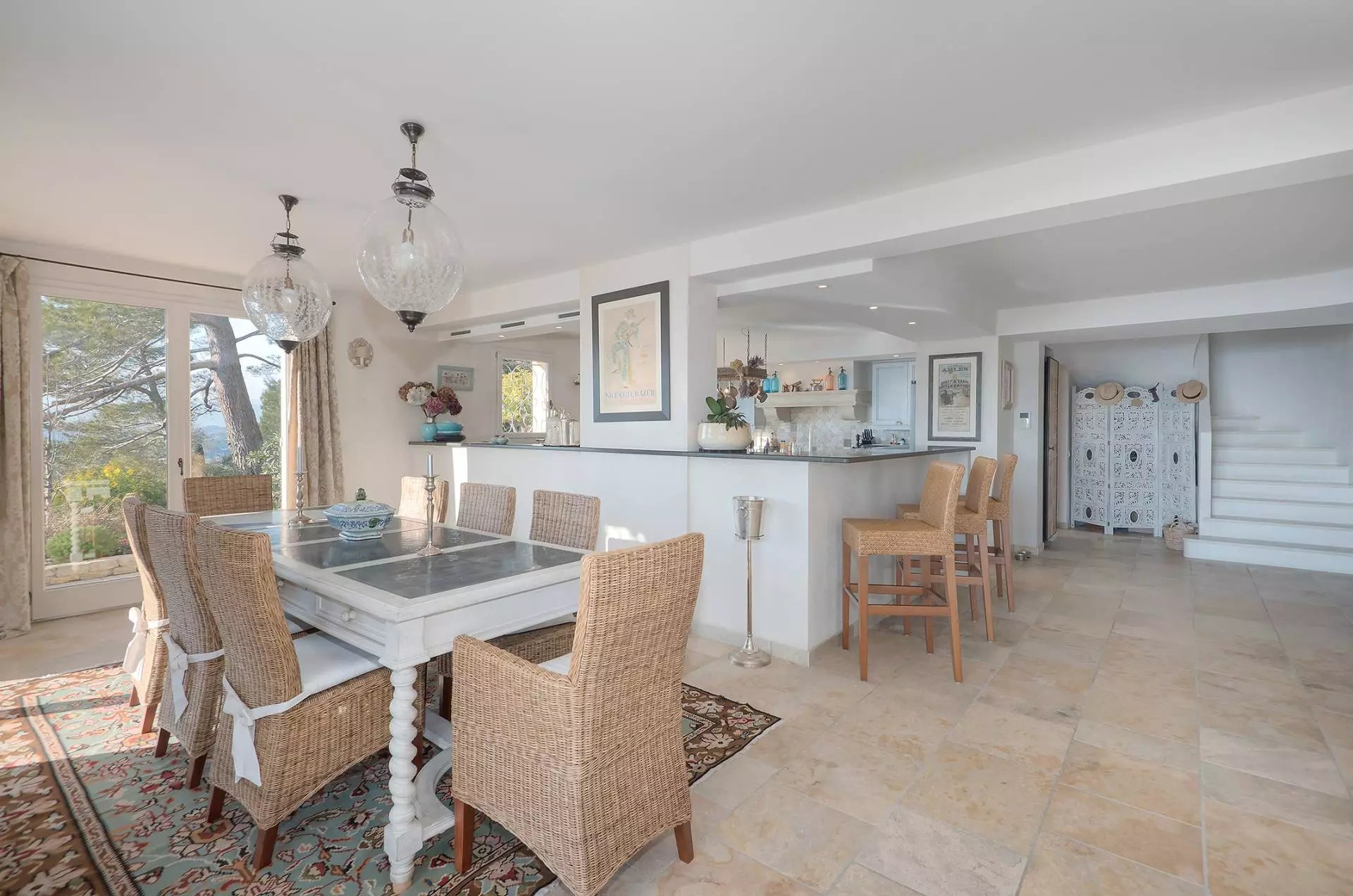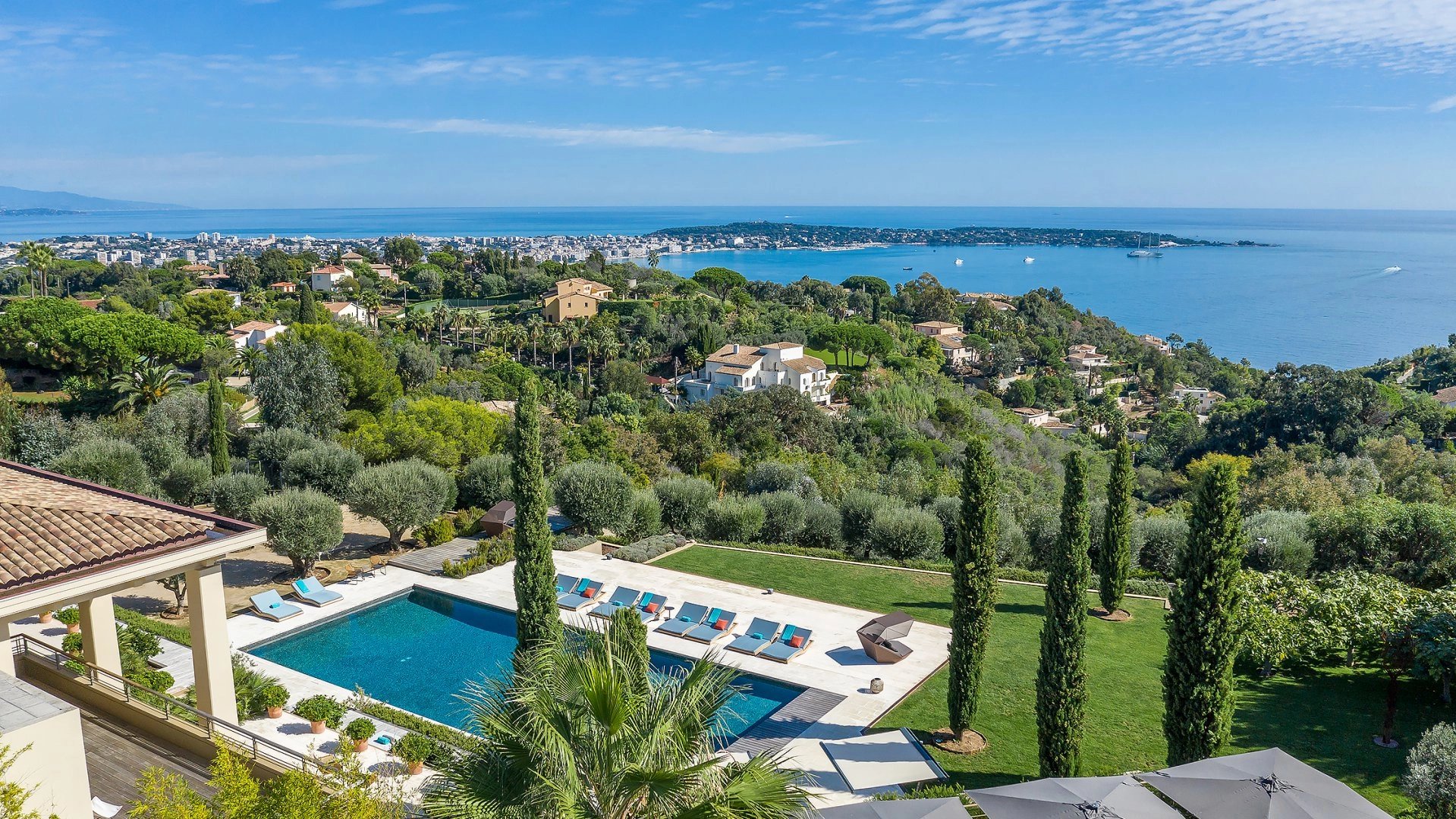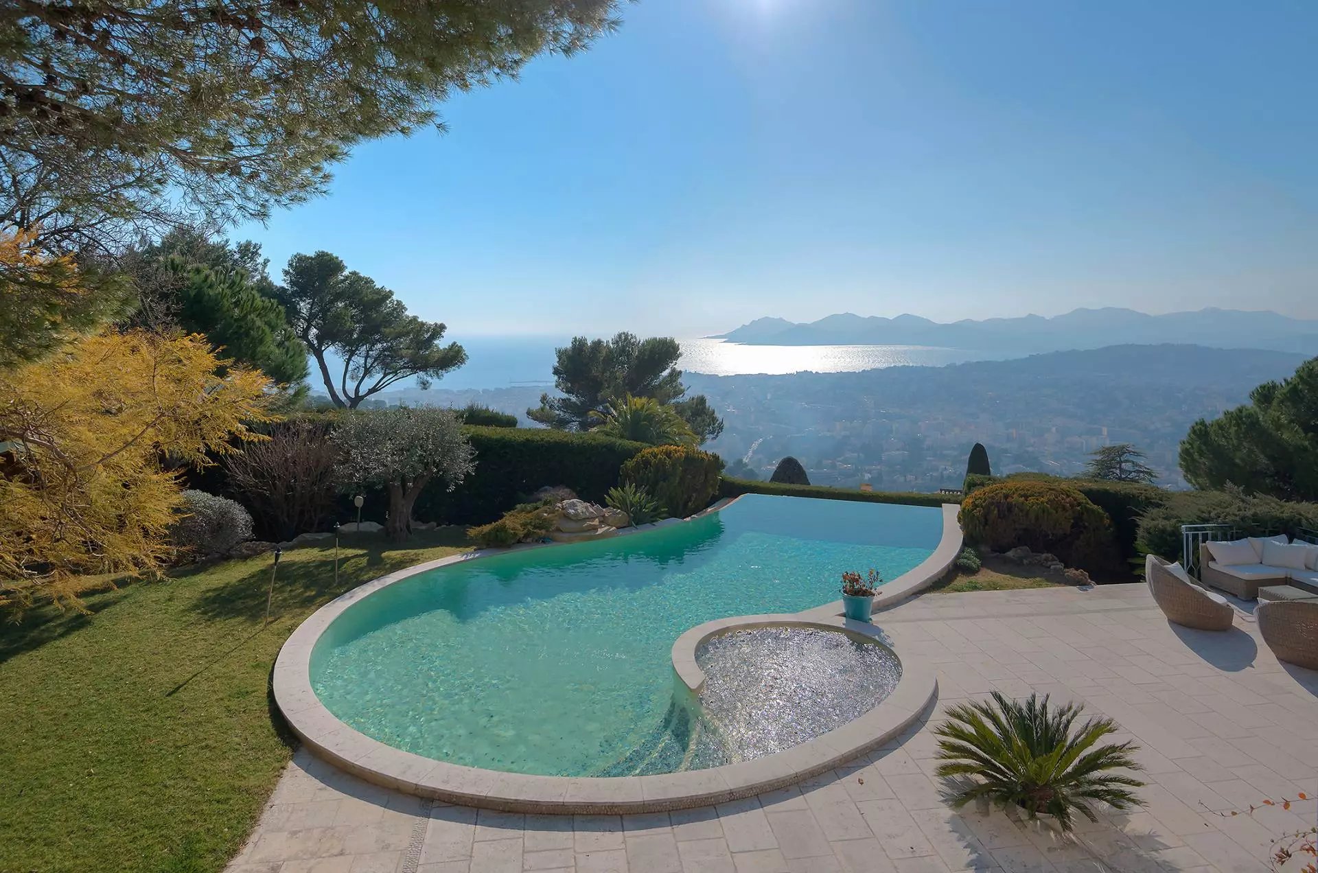 Superbe villa provençale dans la Californie de 350 m² environ, comprenant : un séjour avec salle à manger et vue sur la baie de Cannes, une cuisine équipée, deux chambres...