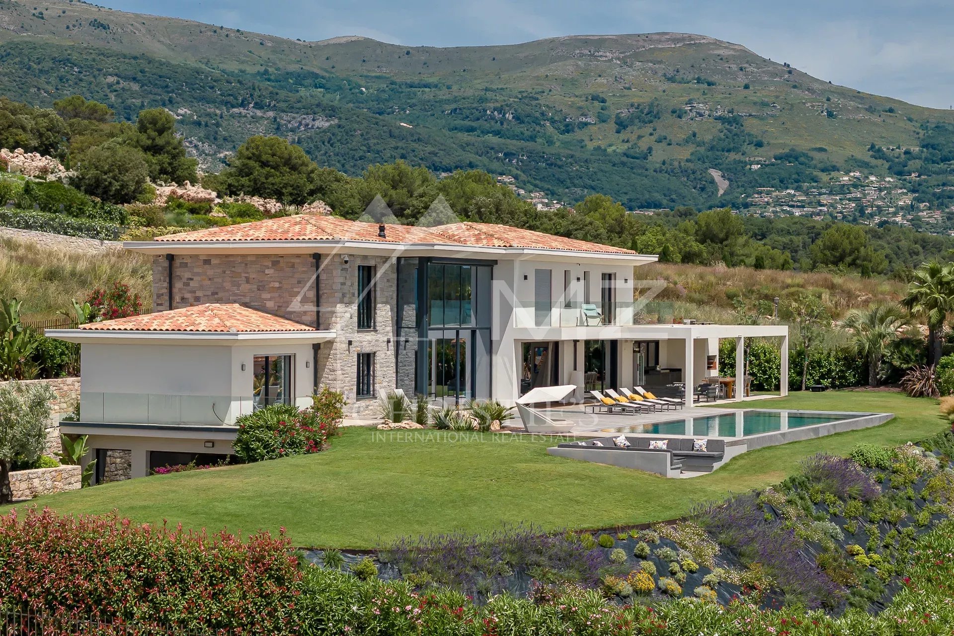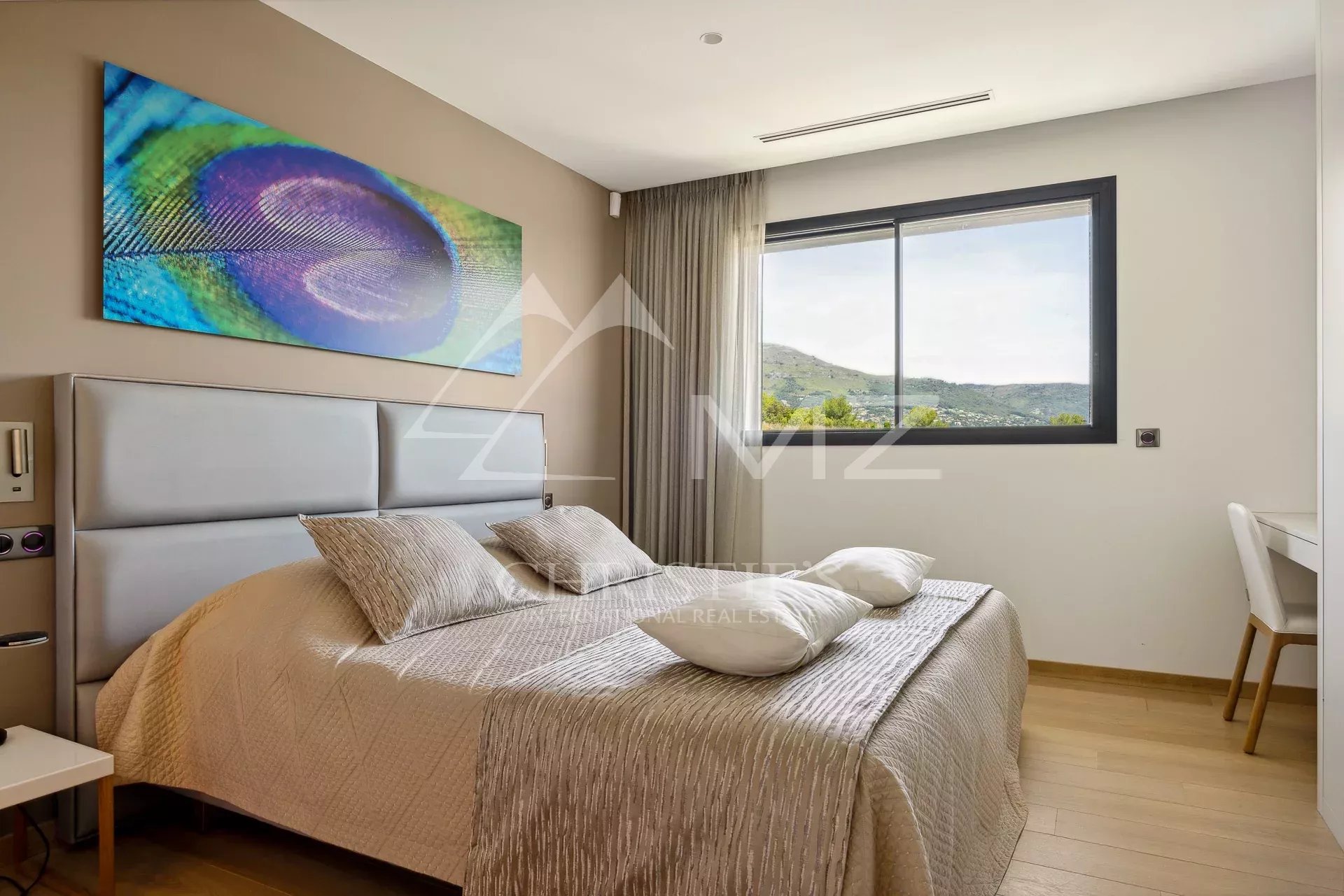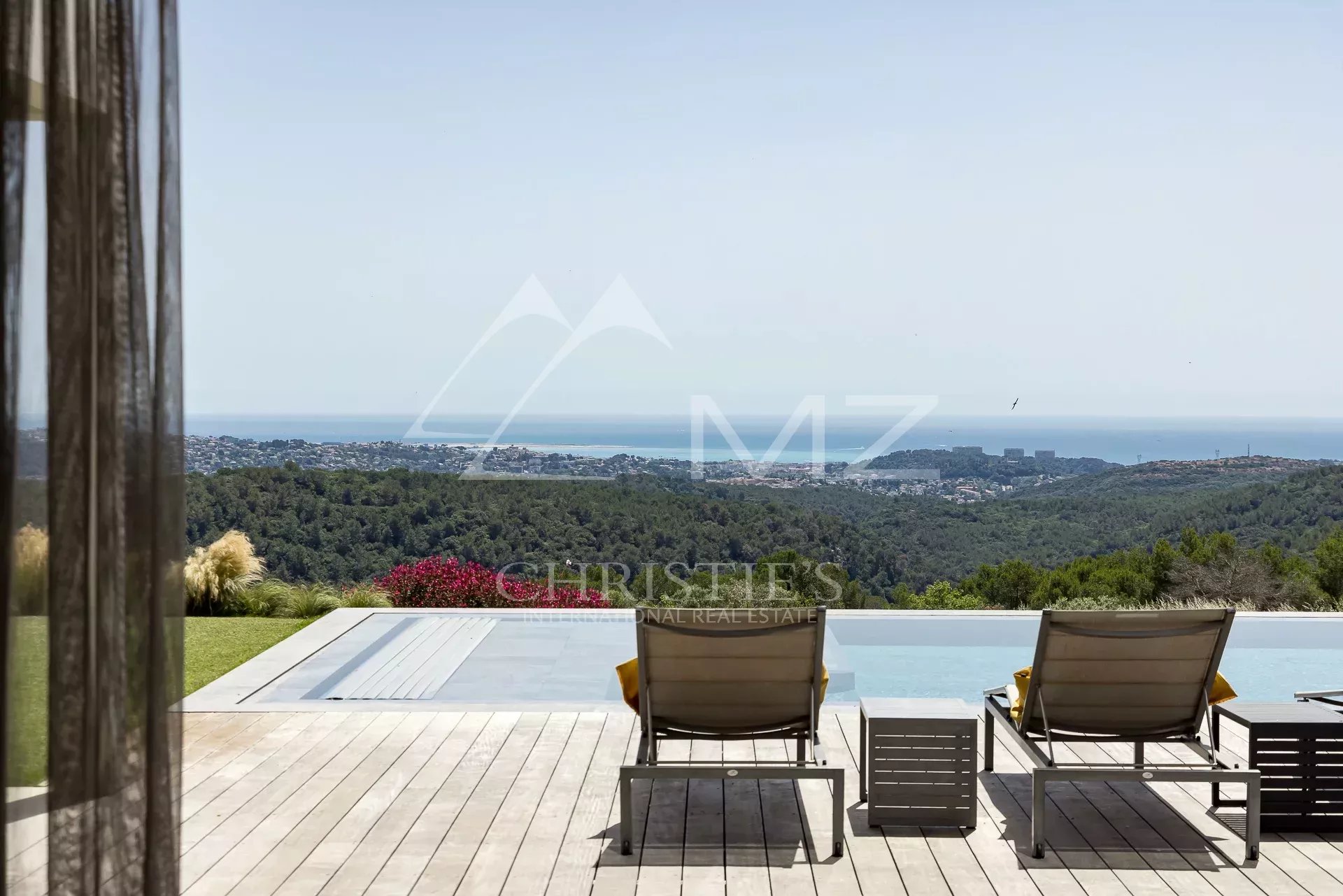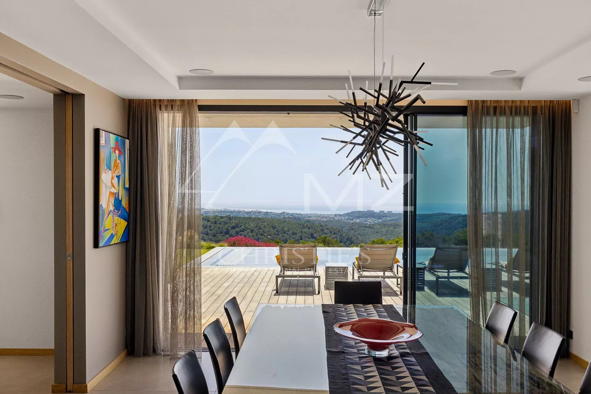 Située à seulement 25 minutes de l'aéroport international de Nice, cette villa contemporaine offre une vue imprenable sur la mer et les collines.