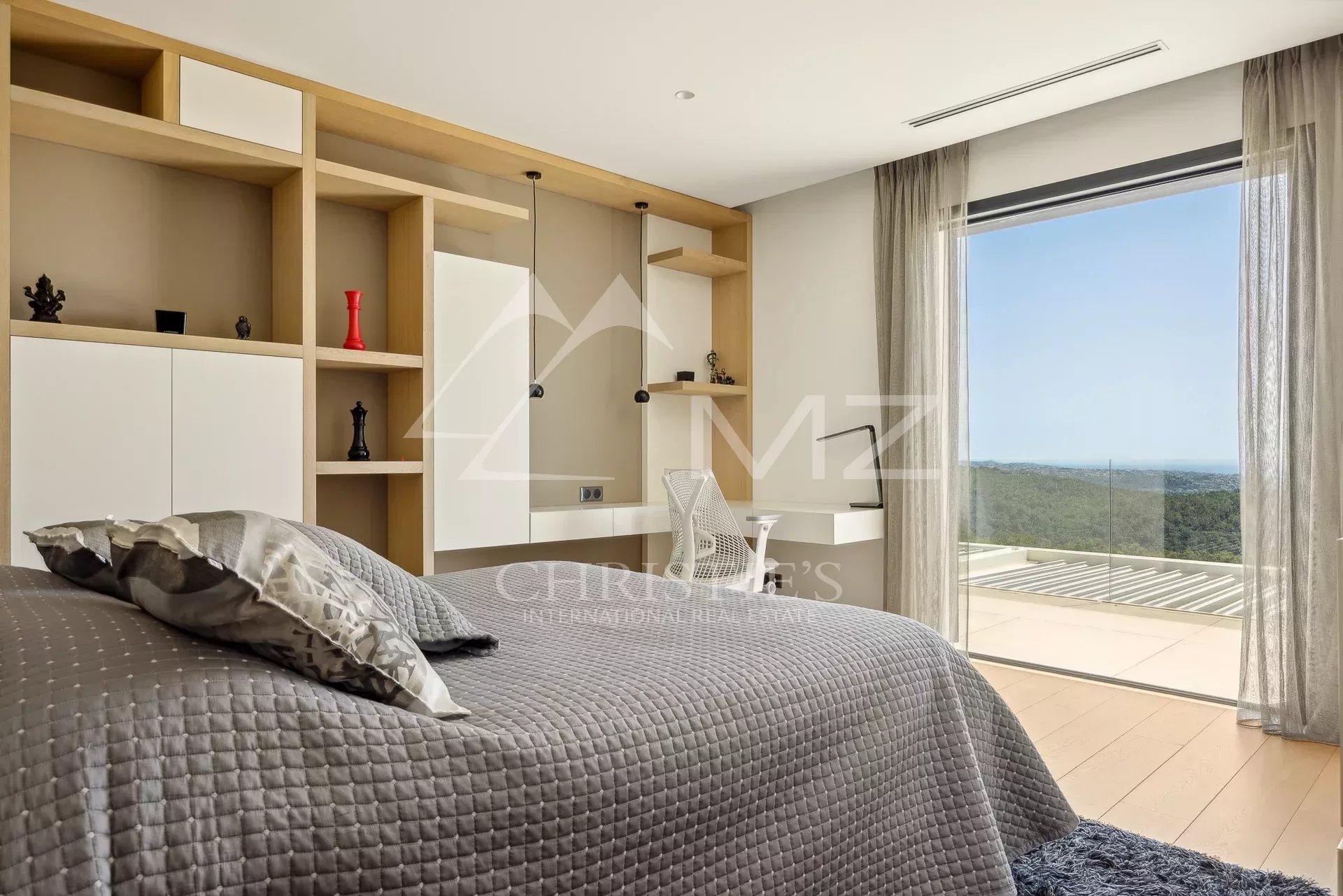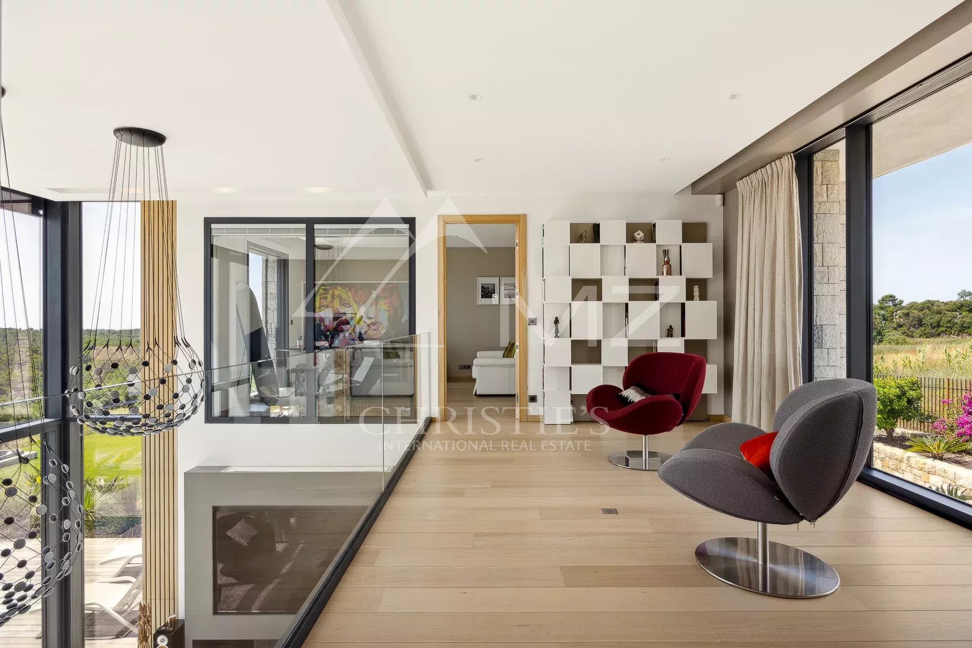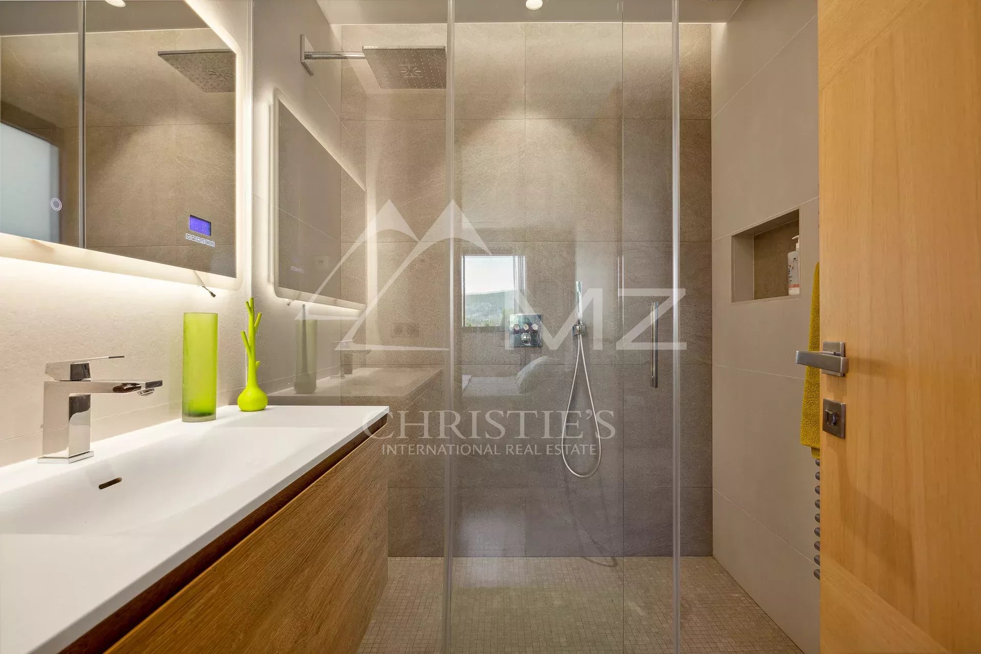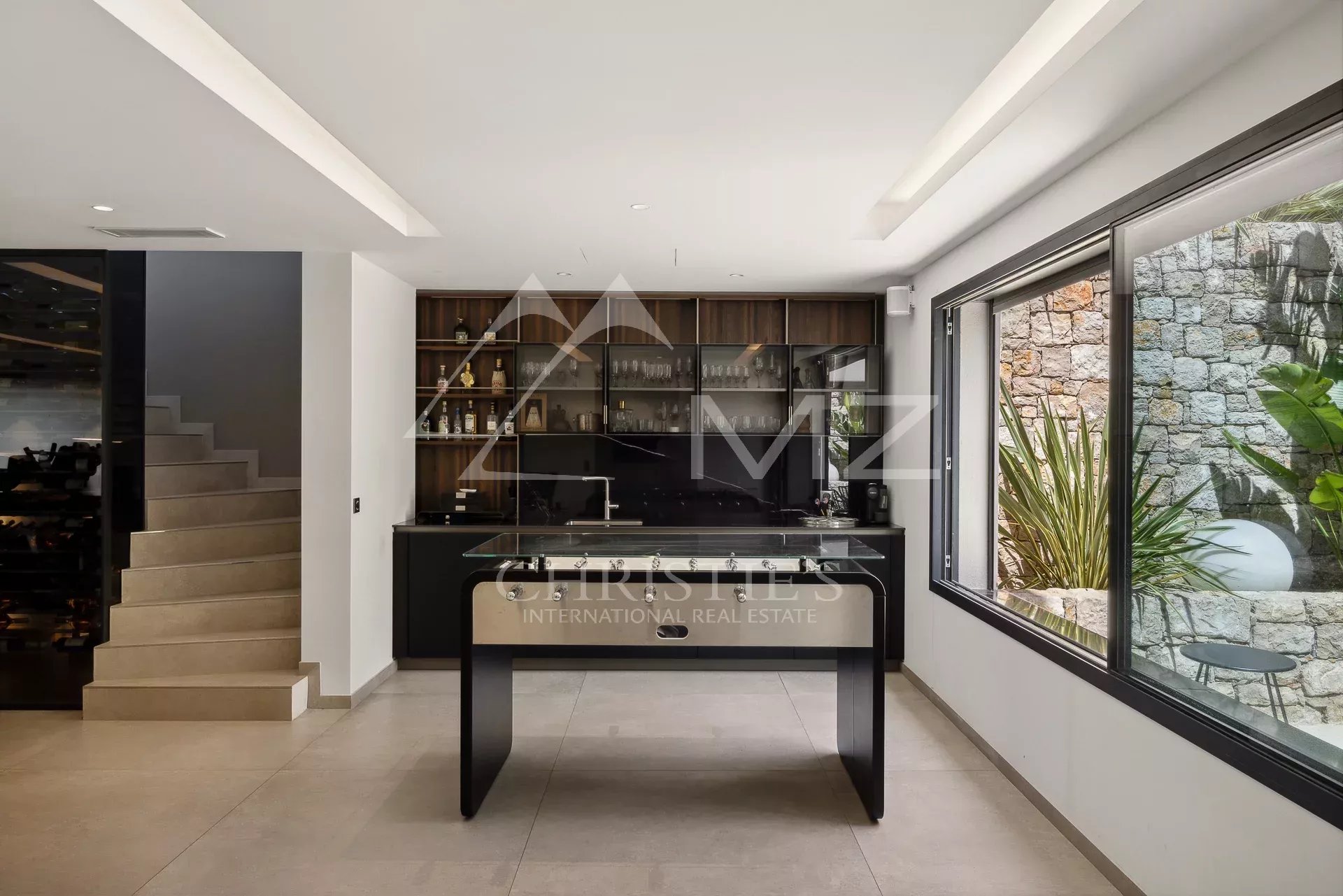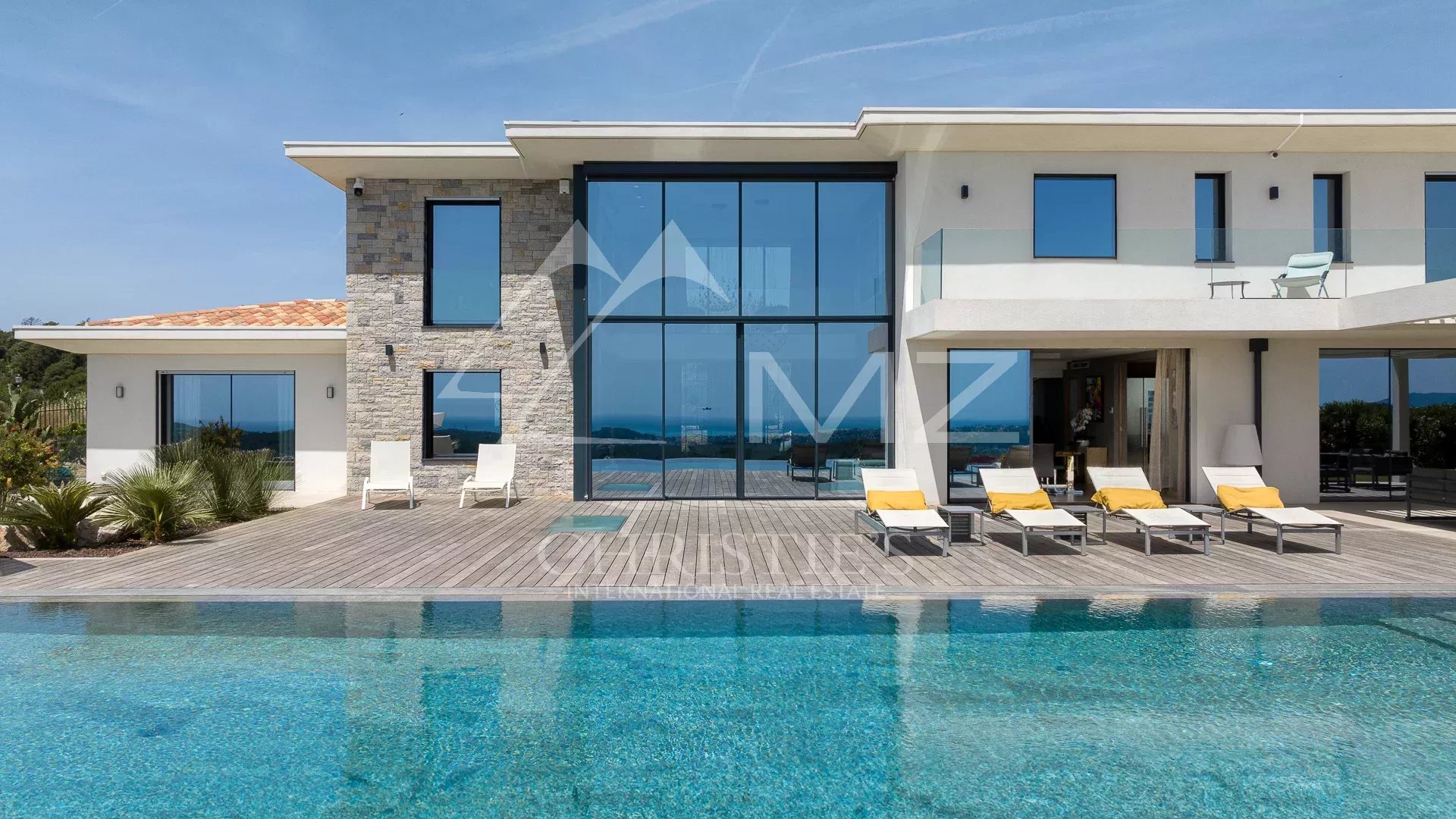 Située à seulement 25 minutes de l'aéroport international de Nice, cette villa contemporaine offre une vue imprenable sur la mer et les collines.