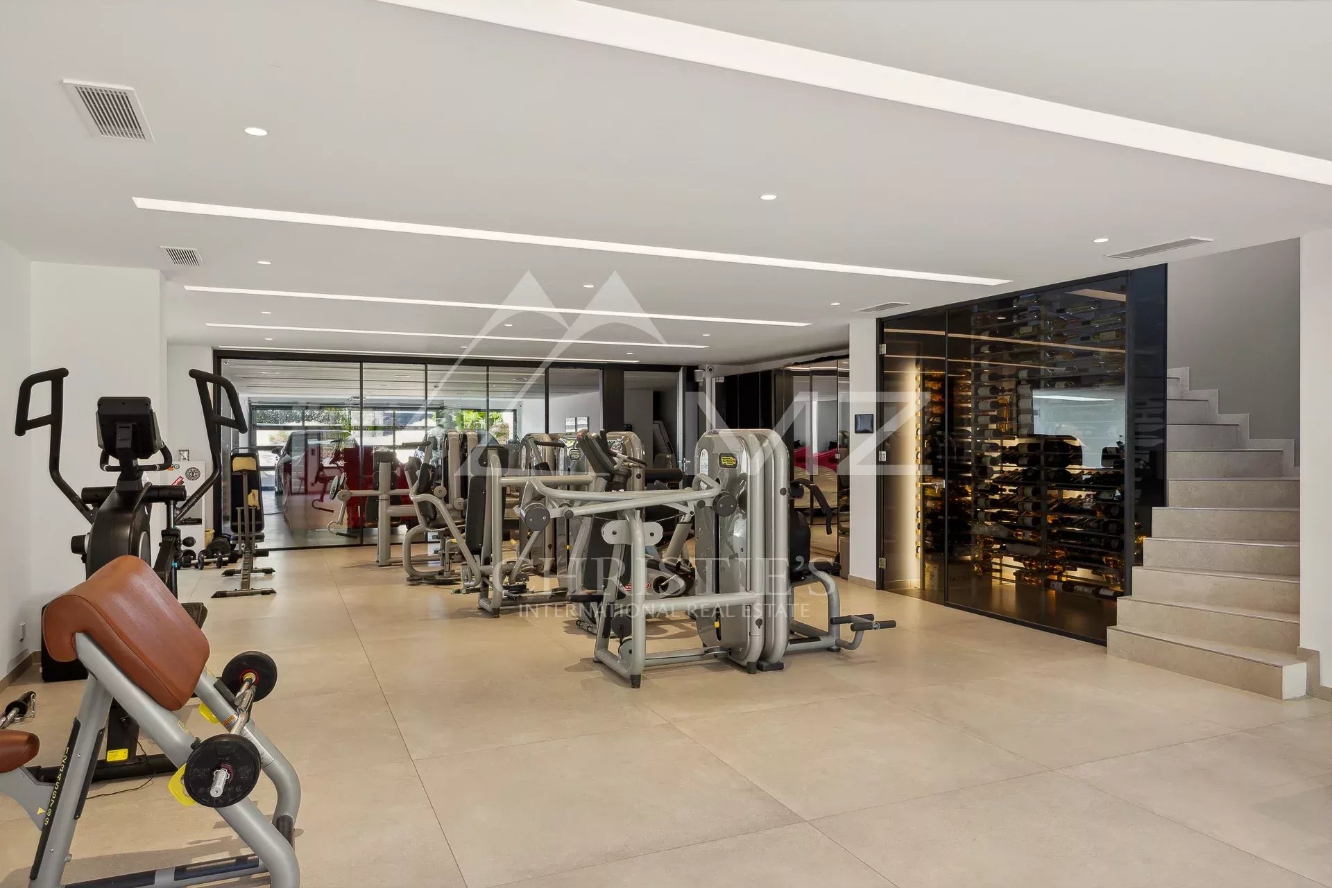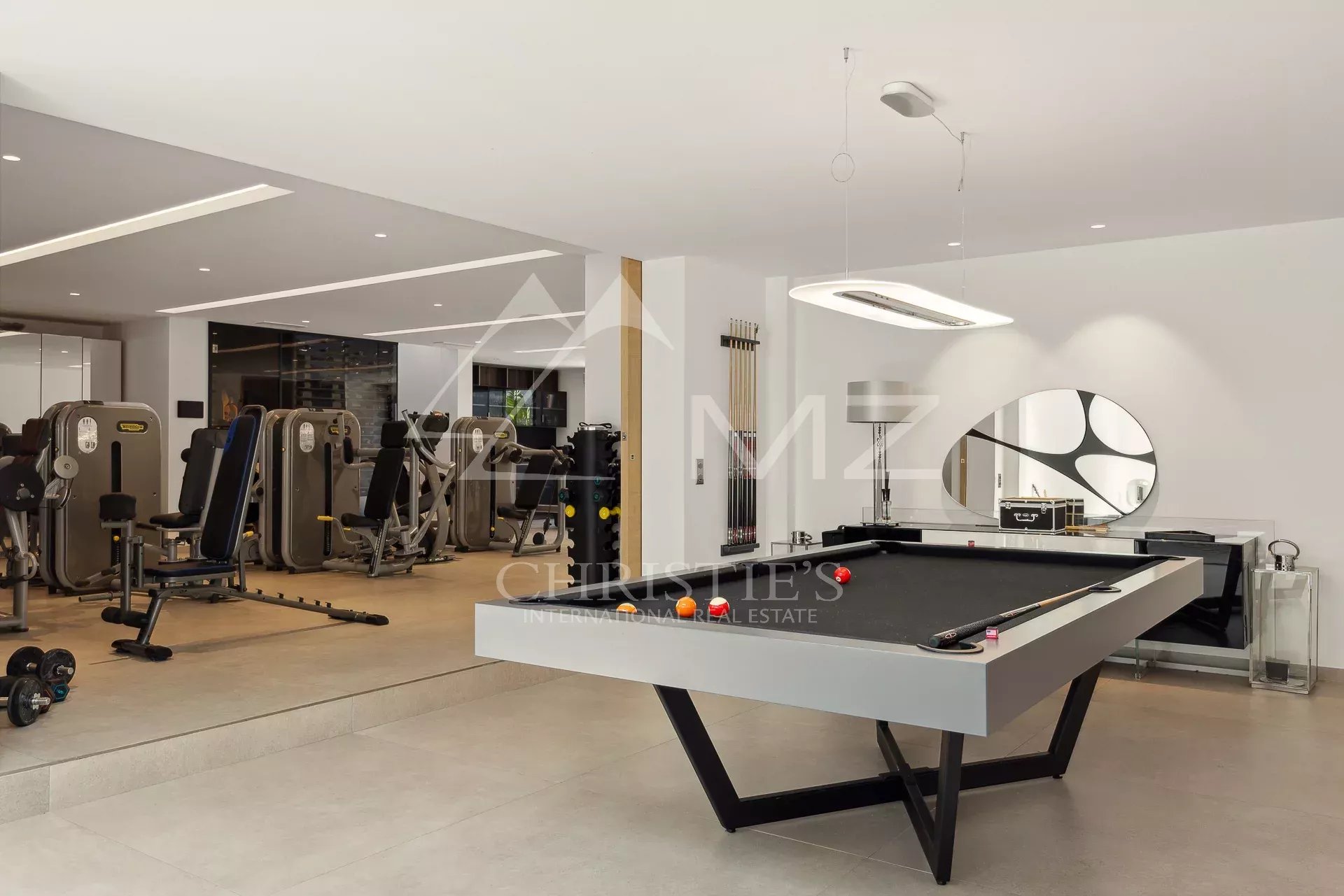 Terrasse couverte équipée d'une cuisine d'été, piscine miroir de 14x4,5m, places de parking et grand garage, salle de sport, billard, babyfoot, appartement indépendant, climatisation.