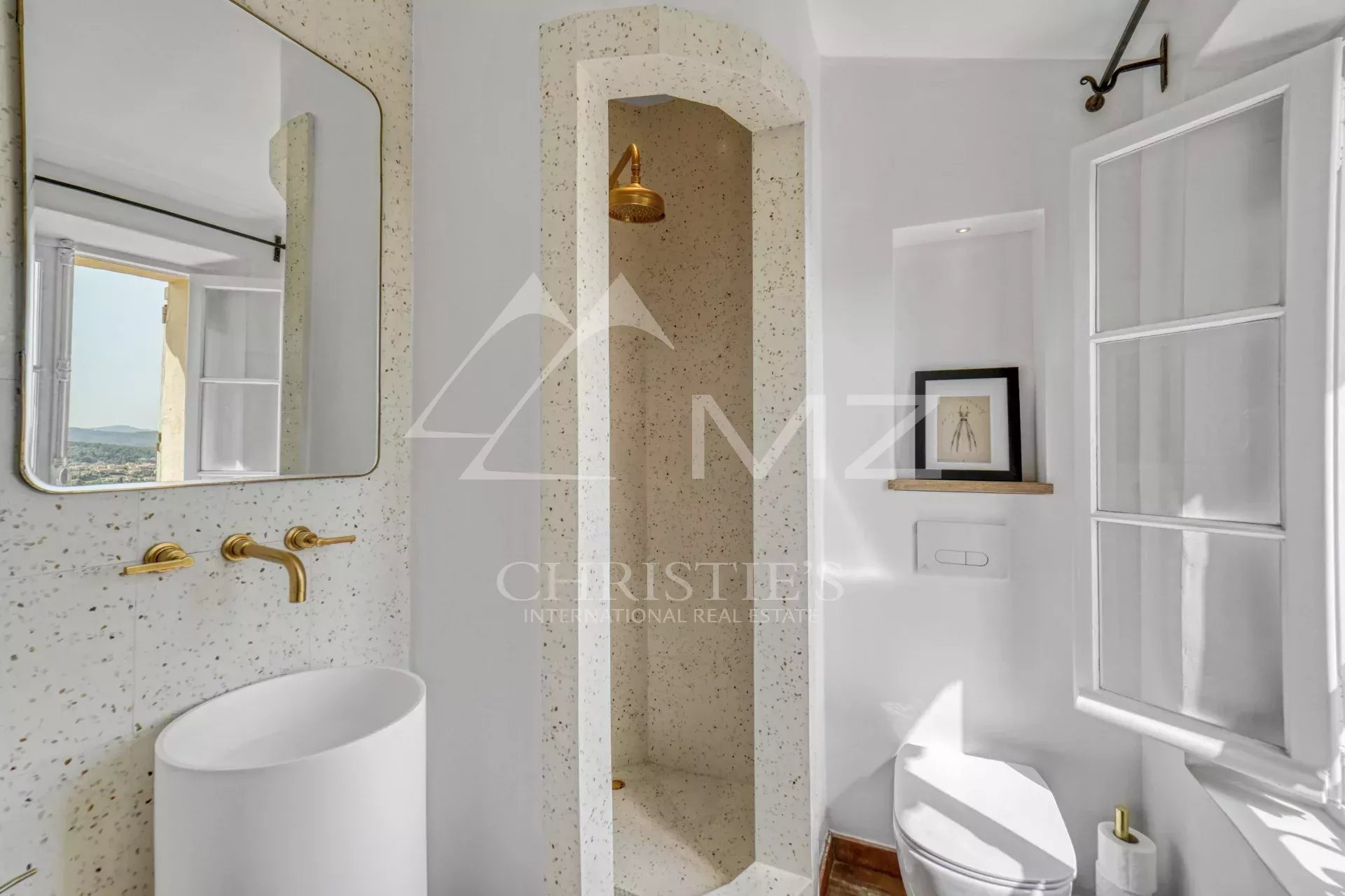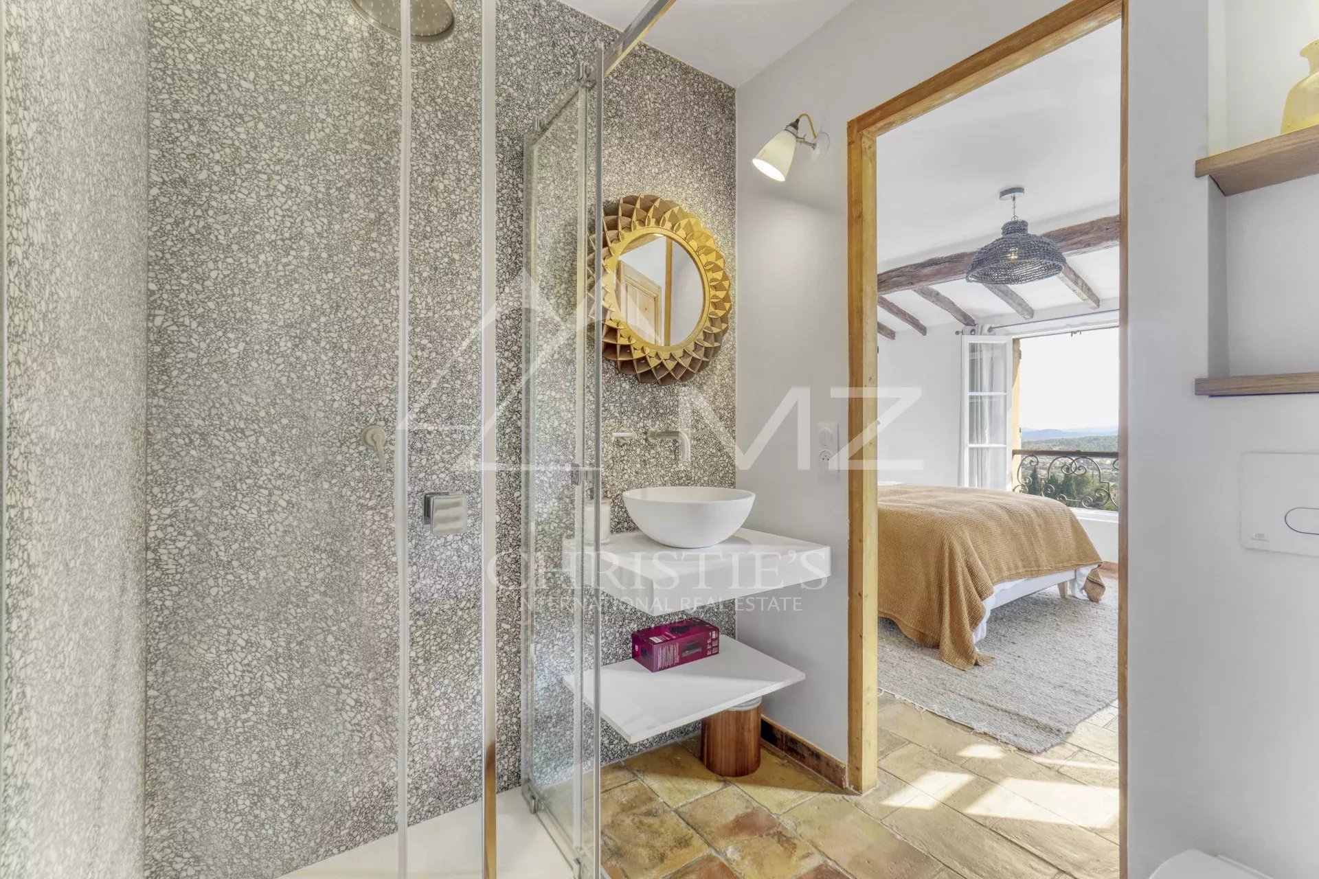En position dominante, avec vue panoramique sur les collines et la mer, cette propriété provençale rénovée bénéficie d'un emplacement idéal à pied du village de Saint-Paul-de-Vence.