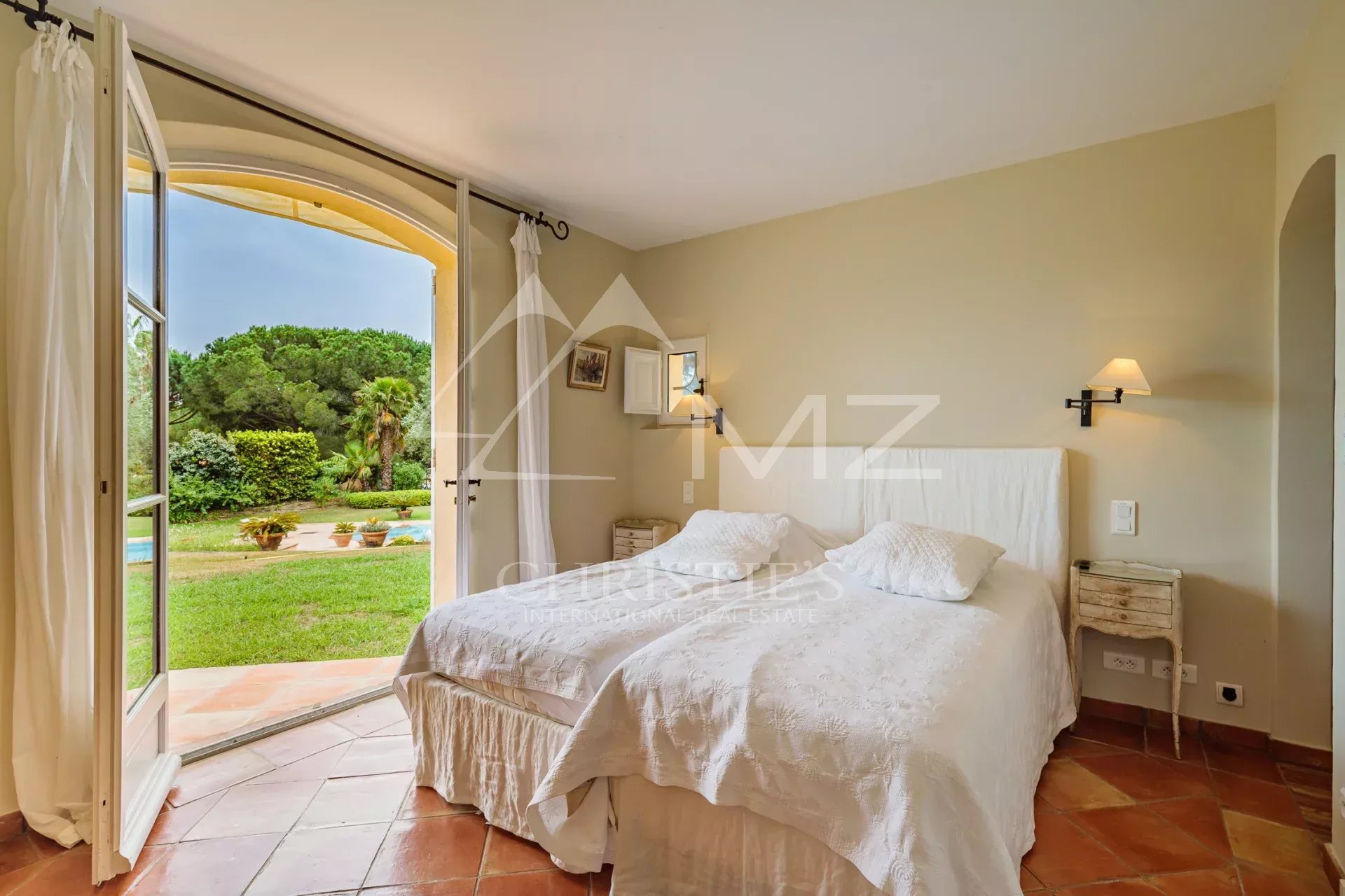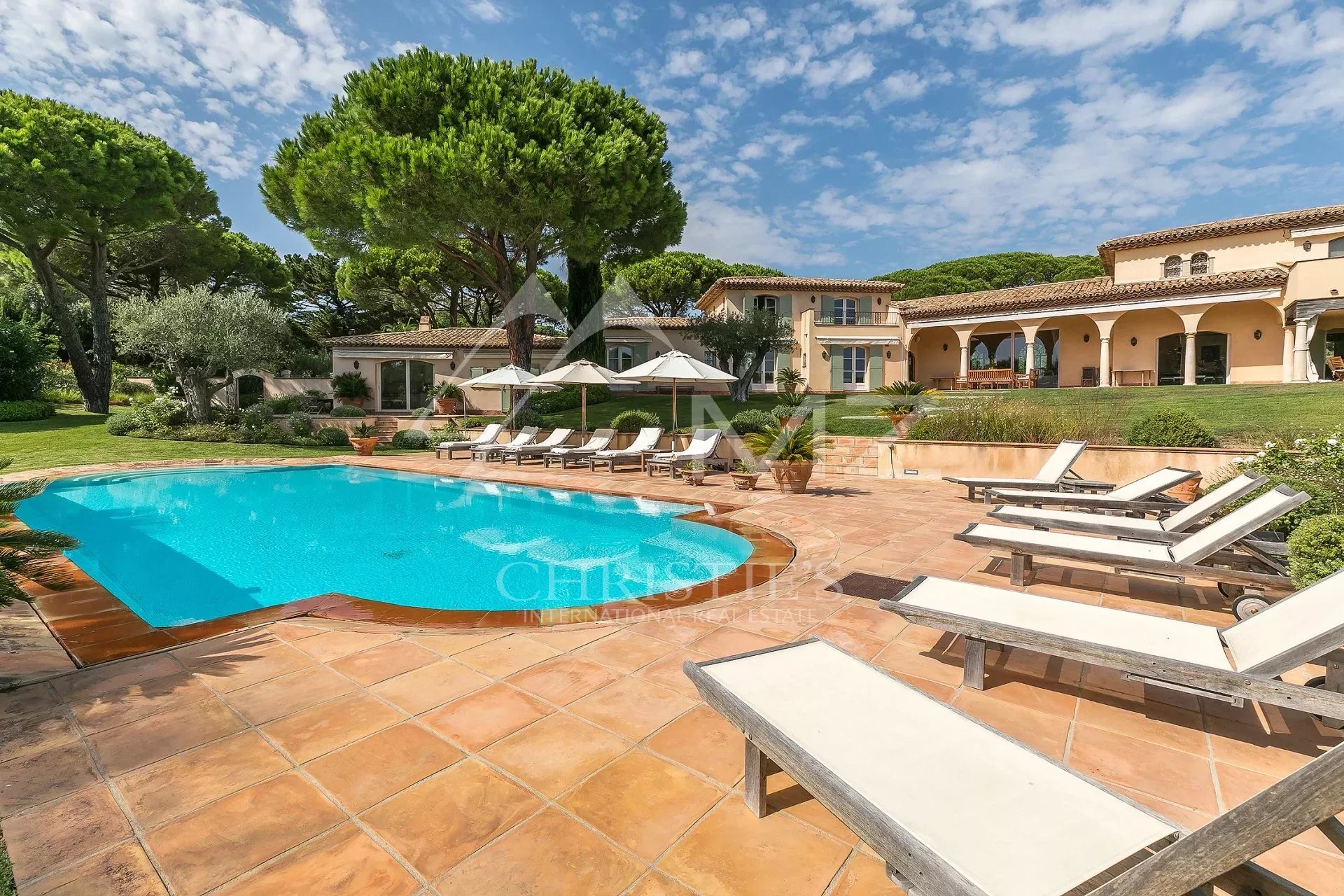 Villa de style méditerranéen exposée plein sud située dans le domaine des Parcs de Saint-Tropez. Elle bénéficie de 6 courts de tennis à moins de 100 mètres ainsi que d’une plage privée pour les résidents du domaine à moins de 500 mètres. Construite en 2003 au coeur d’un terrain boisé et paysager de 6000 m² rafraîchi de nombreuses fontaines, elle propose trois salles à manger extérieures, un pool-house, un terrain de pétanque, une piscine chauffée et environ 400 m² de terrasses. La maison et ses dépendances comprennent 7 chambres.