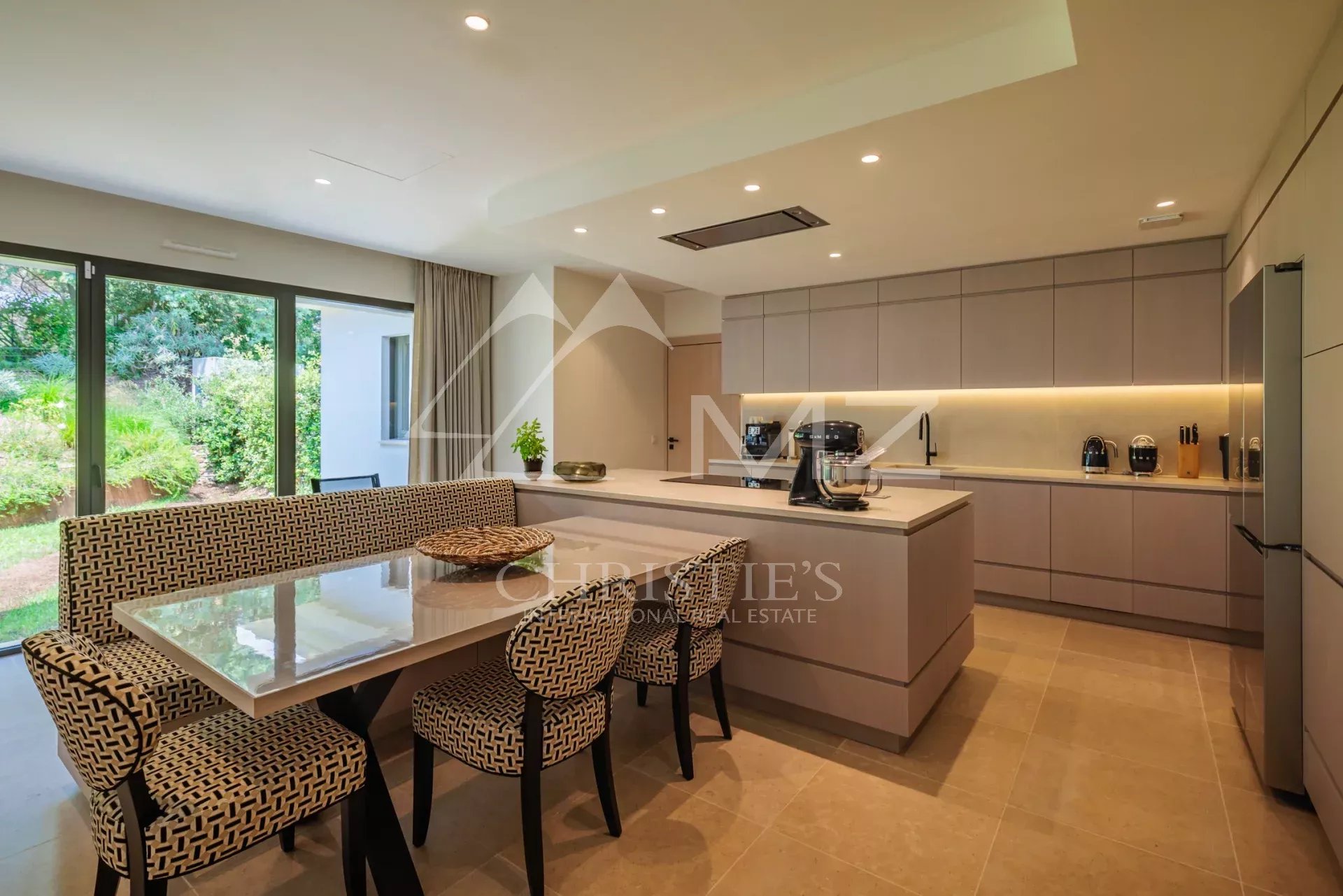 Belle villa contemporaine dans le domaine sécurisé des Parcs de Saint Tropez, offre de jolies de pièces de vie intérieures dont un salon, une salle à manger, une cuisine entièrement équipée, 6 chambres en suite dont une chambre de maître avec sa terrasse, une salle de massage avec un hammam et une salle de sport.