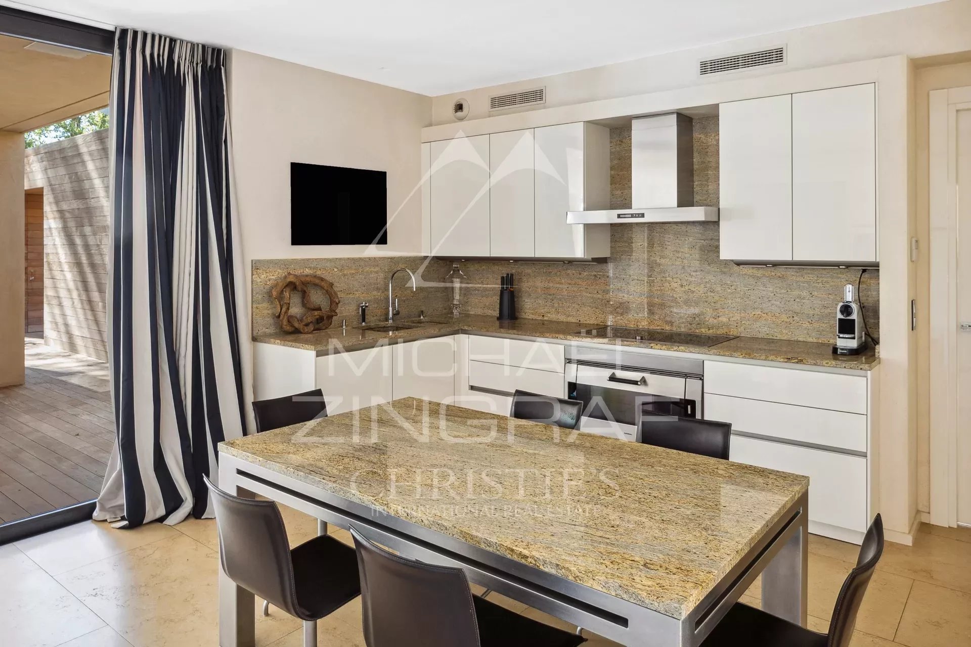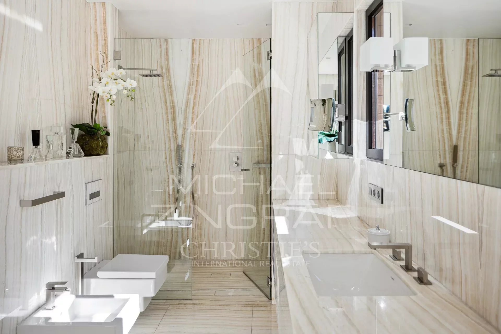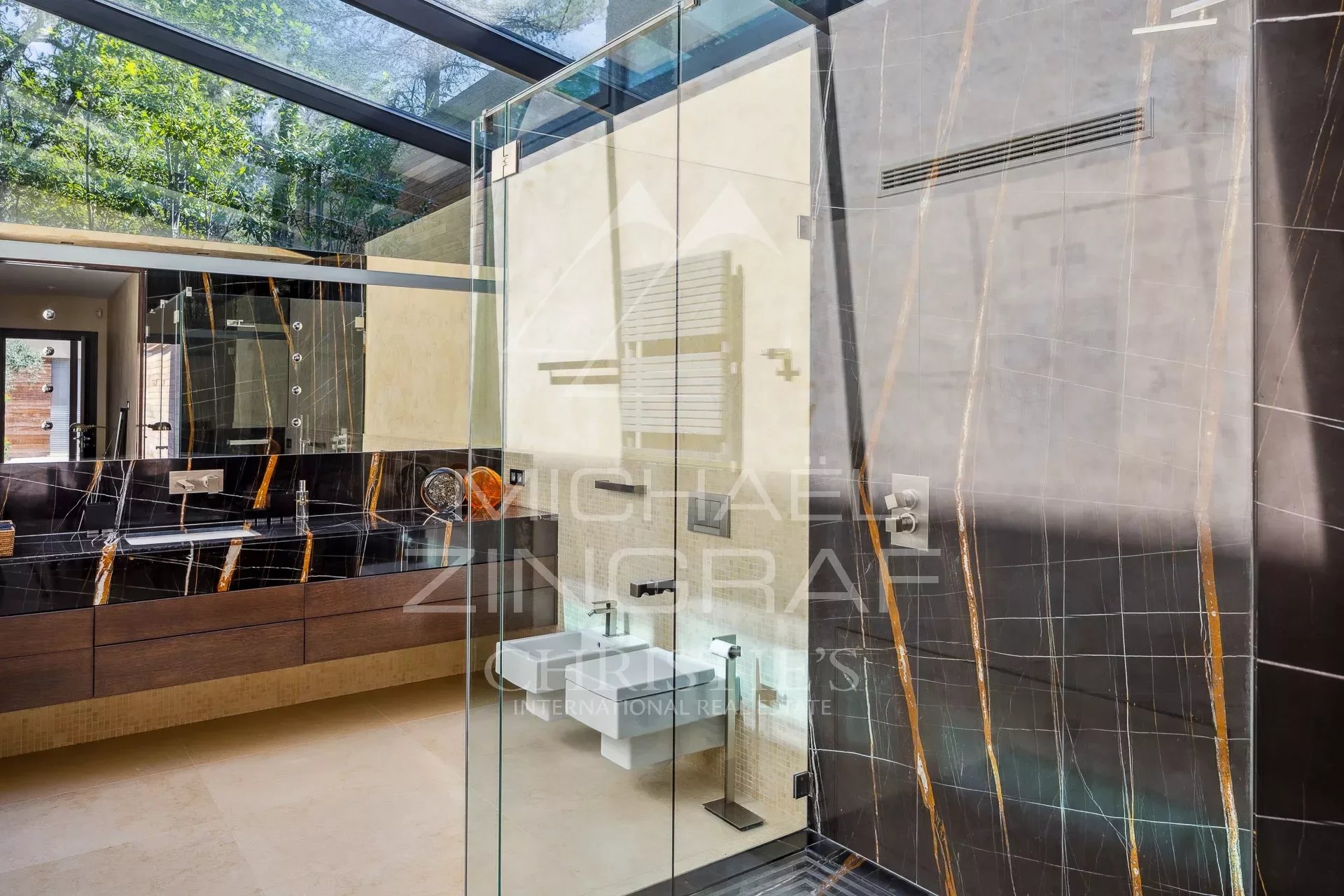 Au rez-de-chaussée, vous découvrirez un vaste hall d'entrée qui s'ouvre sur un élégant séjour, une salle à manger et une cuisine séparée entièrement équipée. Deux chambres en suite, chacune avec sa salle de douche et son dressing, un bureau, ainsi qu'un accès à un studio indépendant entièrement équipé, avec sa propre entrée, le tout ouvrant sur de superbes terrasses