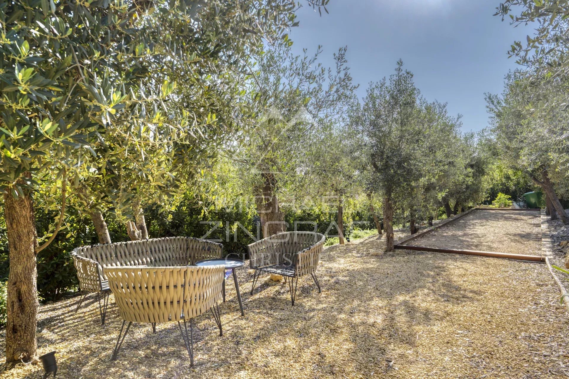 Côté extérieur, la propriété dispose d’une piscine à débordement au sel (12 x 3 m), d’un terrain de pétanque, ainsi que d’une cuisine d’été avec réfrigérateur et évier. Plusieurs places de stationnement, un portail électrique et des caméras extérieures viennent compléter les équipements. La villa est entièrement climatisée.