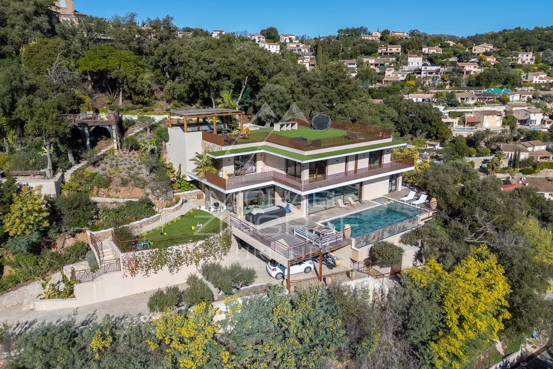 Située sur les hauteurs de Mandelieu, sur la commune des Adrets de l'Estérel, propriété moderne d'exception offrant une superbe vue mer. Villa principale composée de 3-4 suites, ascenseur, home cinéma,...