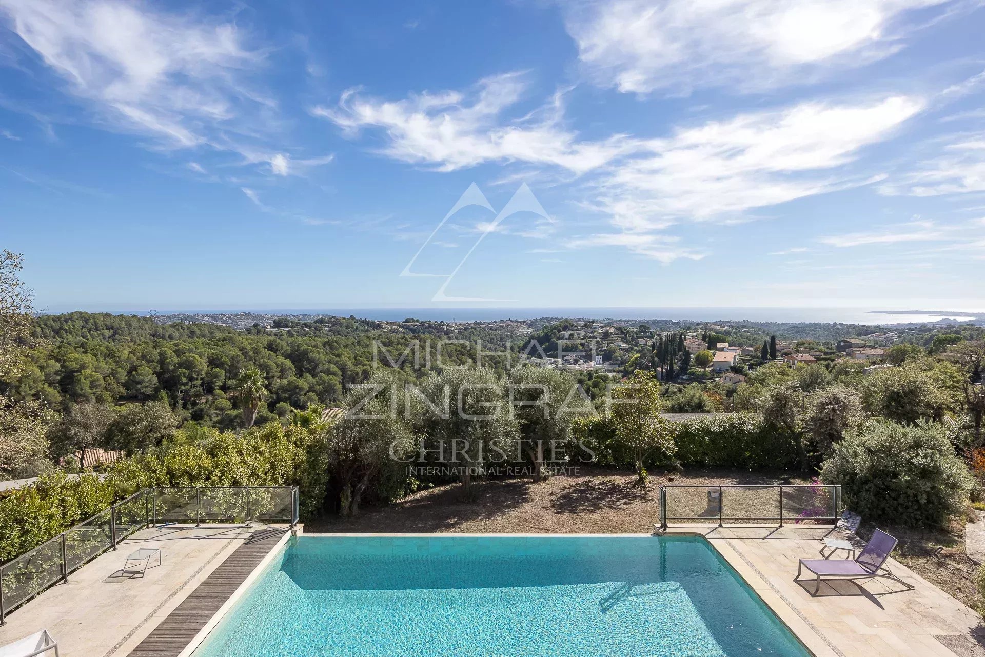 Propriété dominante d'environ 275m2 avec vue mer, entierement rénovée en 2024, et idéalement située sur les hauteurs résidentielles de Vence. Bâtie sur plus de 2800m2 de terrain paysager avec gout,...