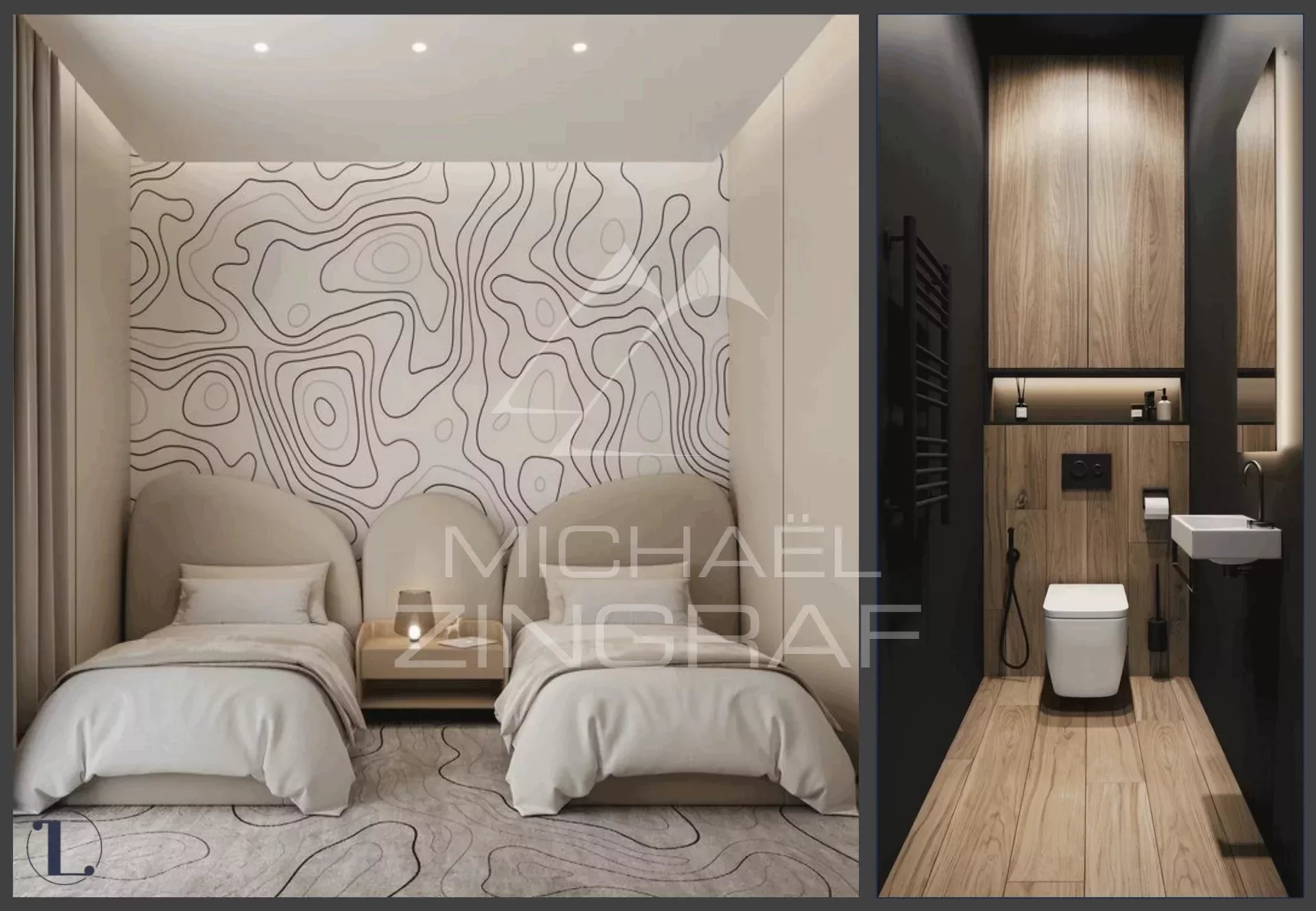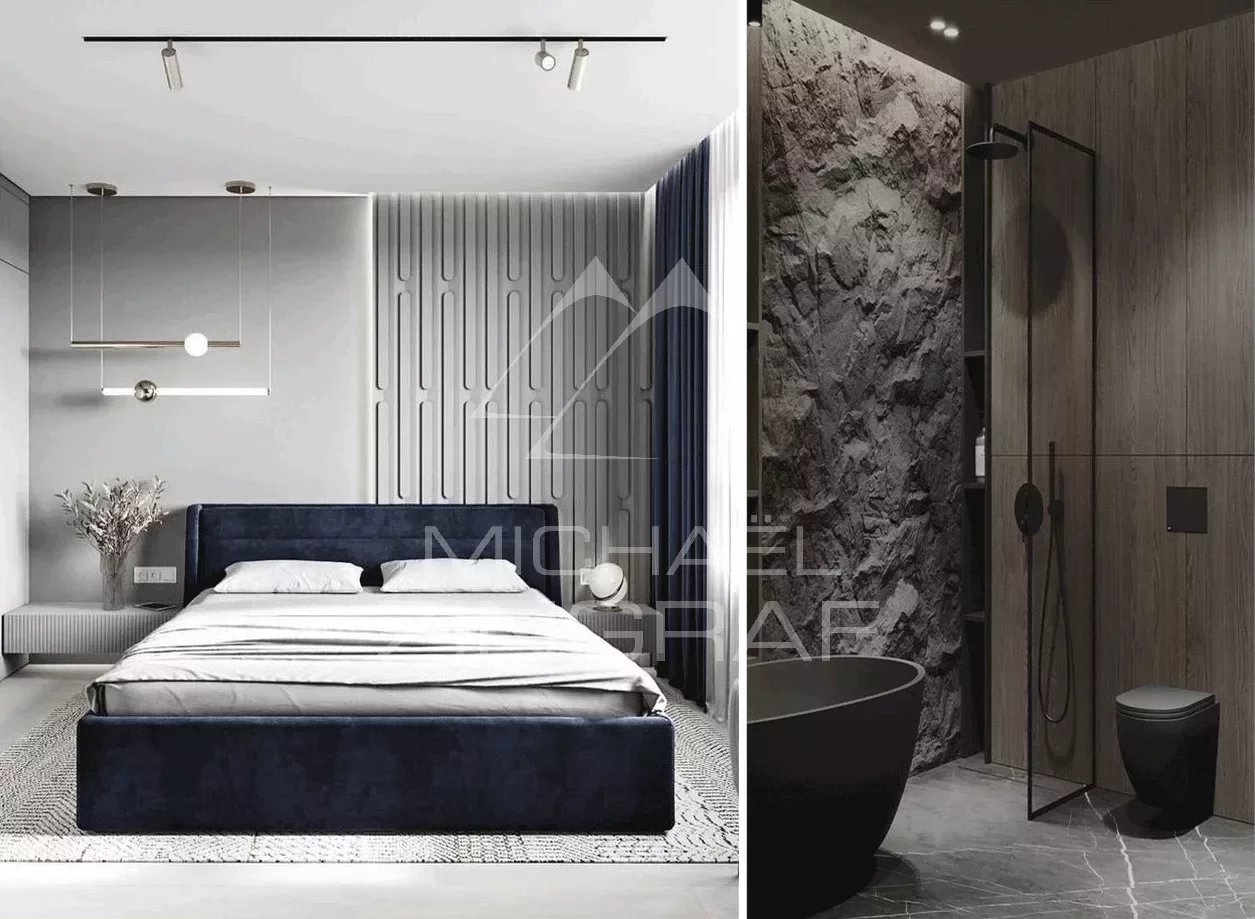 La cuisine et les dressings sont entièrement réalisés sur mesure. La cuisine est équipée d'électroménagers (réfrigérateur américain, four, micro-ondes, plaque de cuisson, hotte aspirante, lave-vaisselle et lave-linge) de marques internationales réputées – Samsung, AEG ou LG.