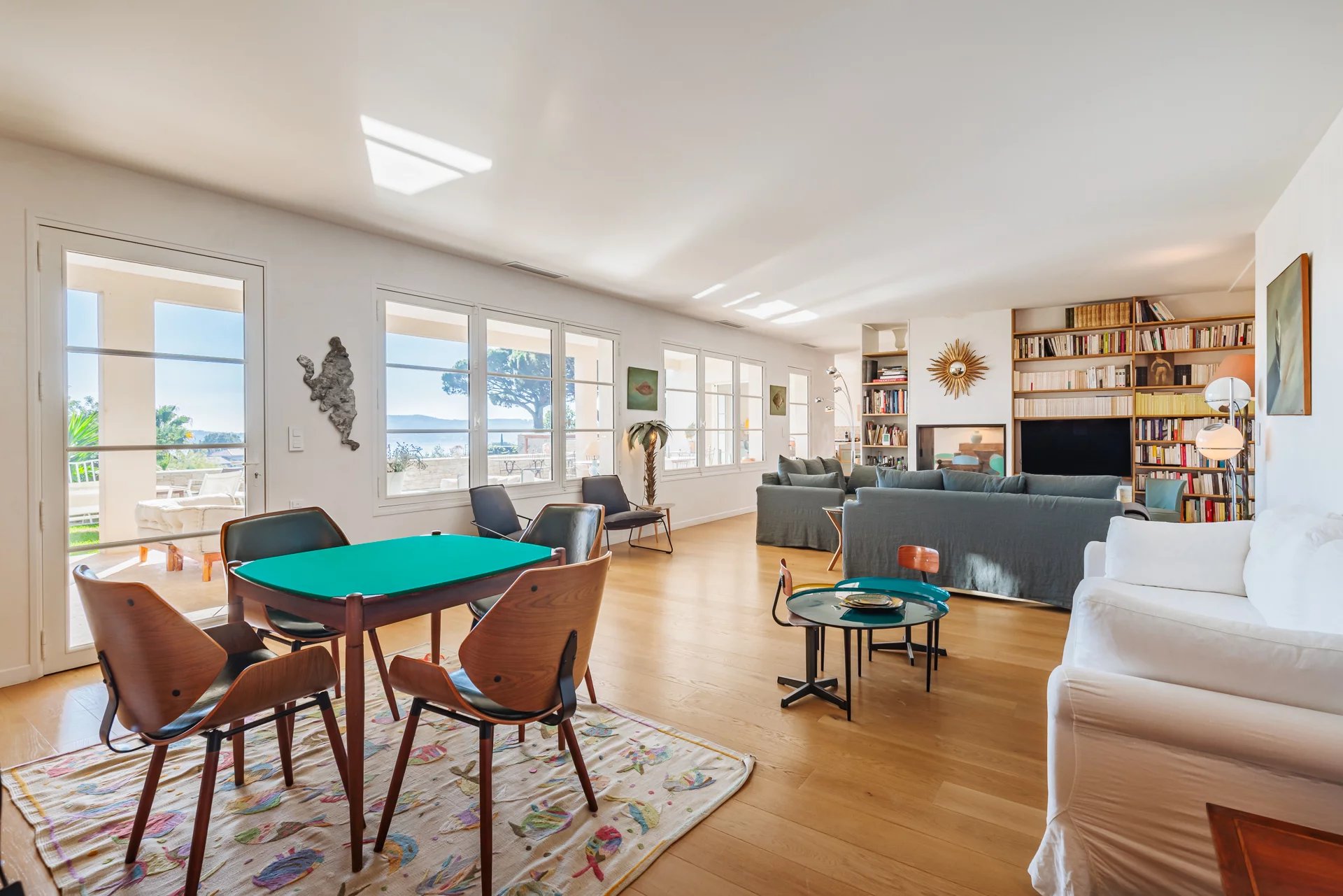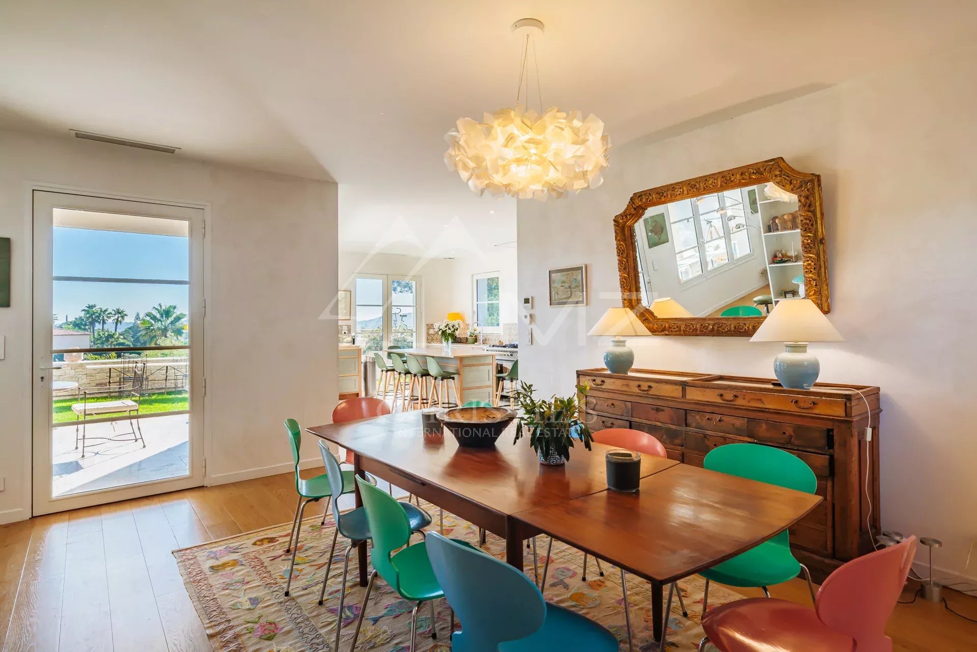 Le rez-de-chaussée, comprend une cuisine avec une arrière-cuisine ainsi qu’une salle à manger et un salon spacieux. Ces espaces de vie s'ouvrent directement sur une terrasse panoramique, idéale pour profiter de la vue mer.