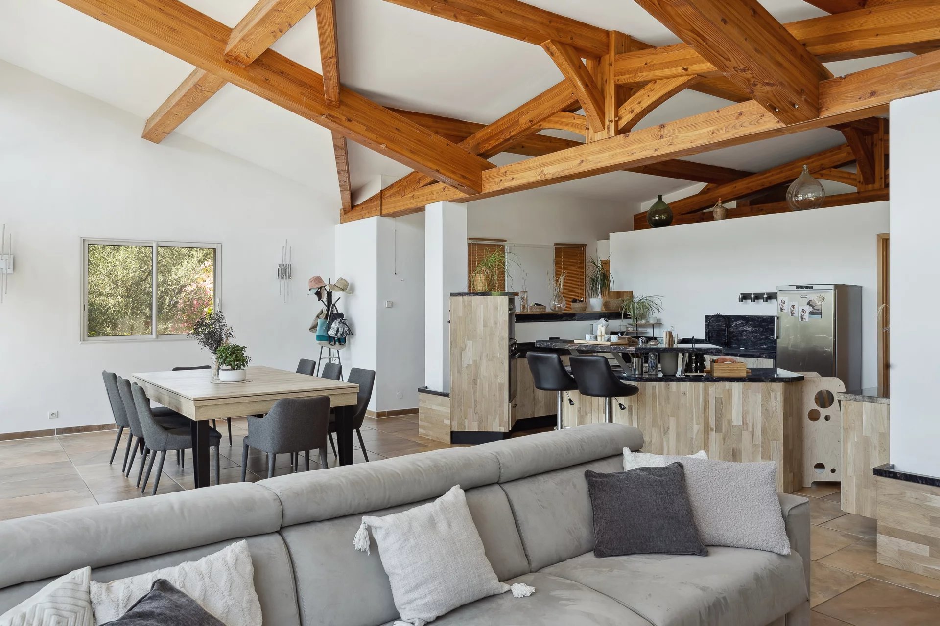 Voilà l'idée de départ. L'arrière de la maison reçoit 4 chambres (dont une suite avec salle de bains) et une salle de douche. Ambiance cosy renforcée par une grande terrasse faisant office de salon d'été. La maison est économe (photovoltaïque et panneaux solaires gèrent l'électricité et l'eau chaude); une cuve de rétention d'eau de 20 m3 environ permet d'arroser. La piscine est à débordement avec un pool house parfaitement équipé.
