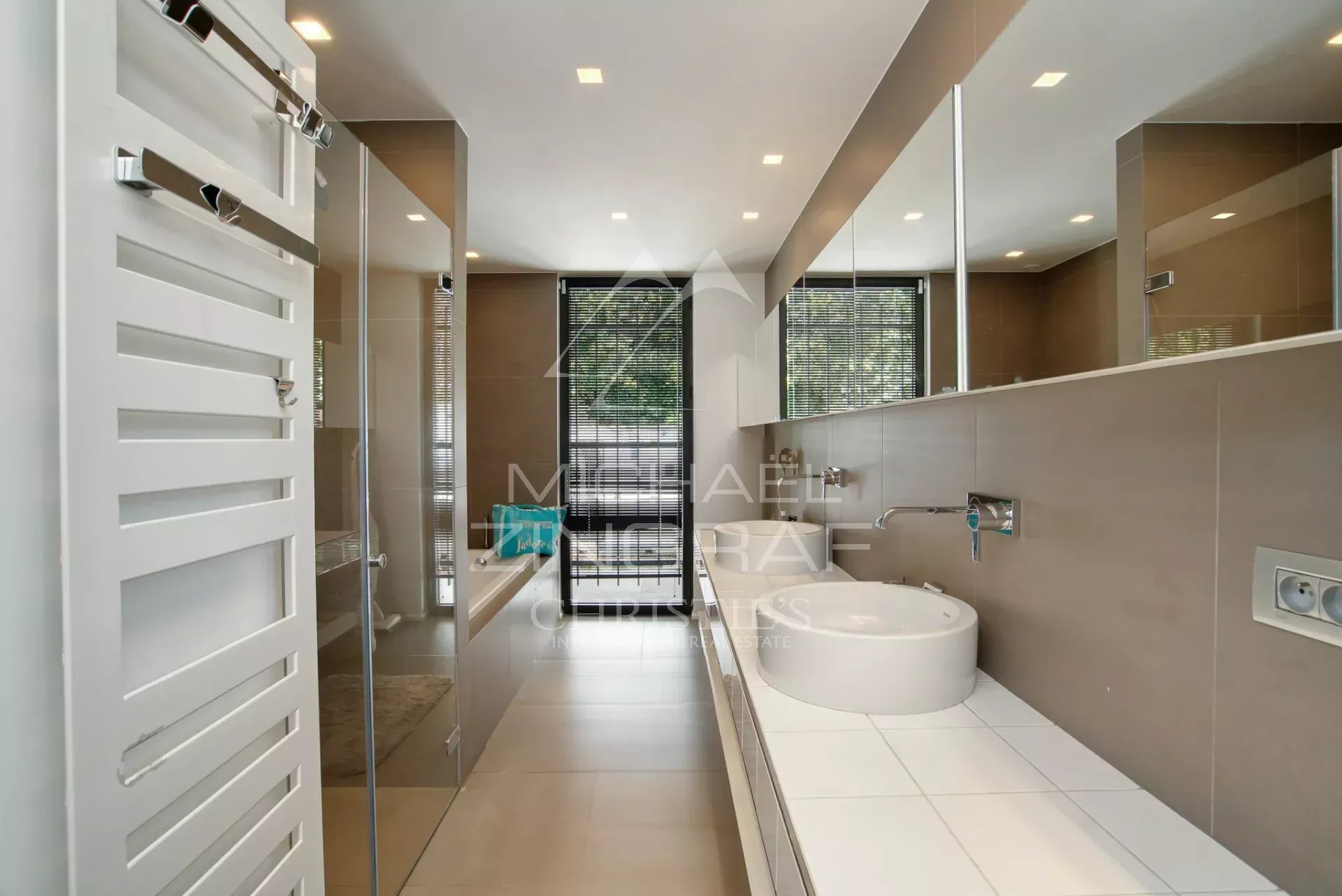 Côté nuit, 4 belles chambres, dont une somptueuse suite parentale, promettent calme et confort. À l’extérieur, une piscine chauffée, un jacuzzi et une salle de sport s’intègrent parfaitement dans un jardin luxuriant, offrant un véritable refuge de tranquillité.