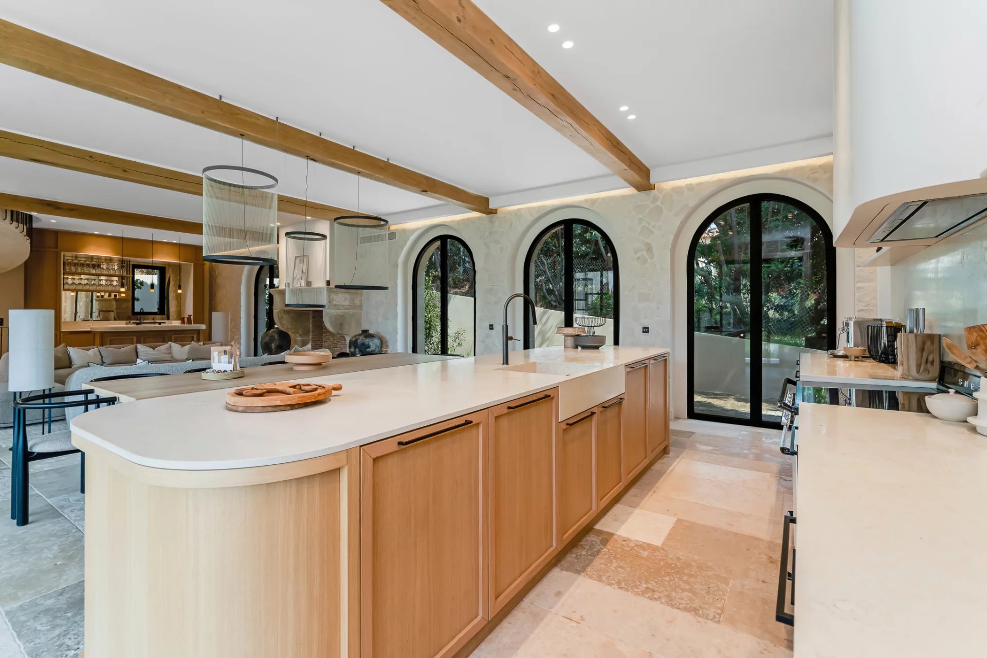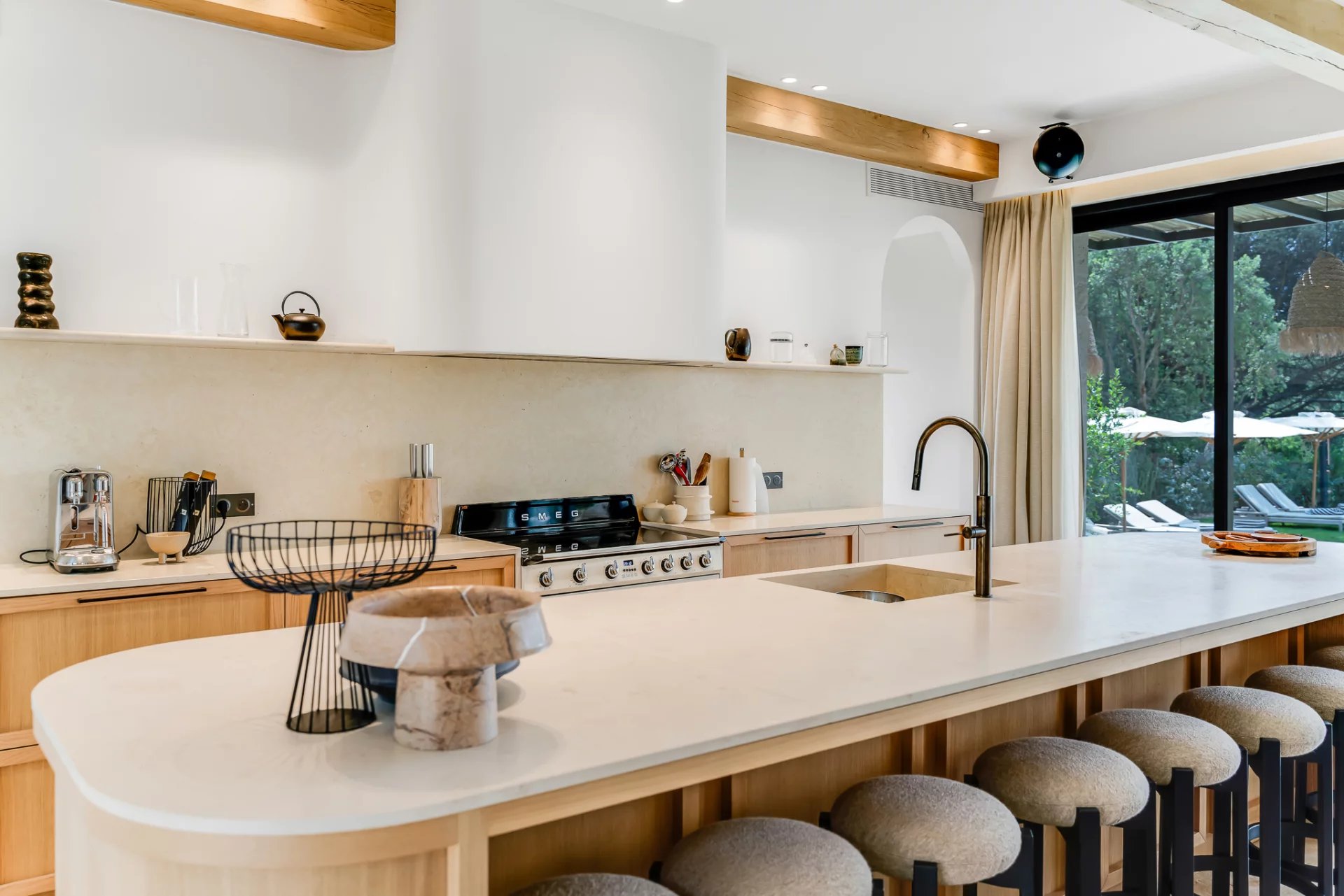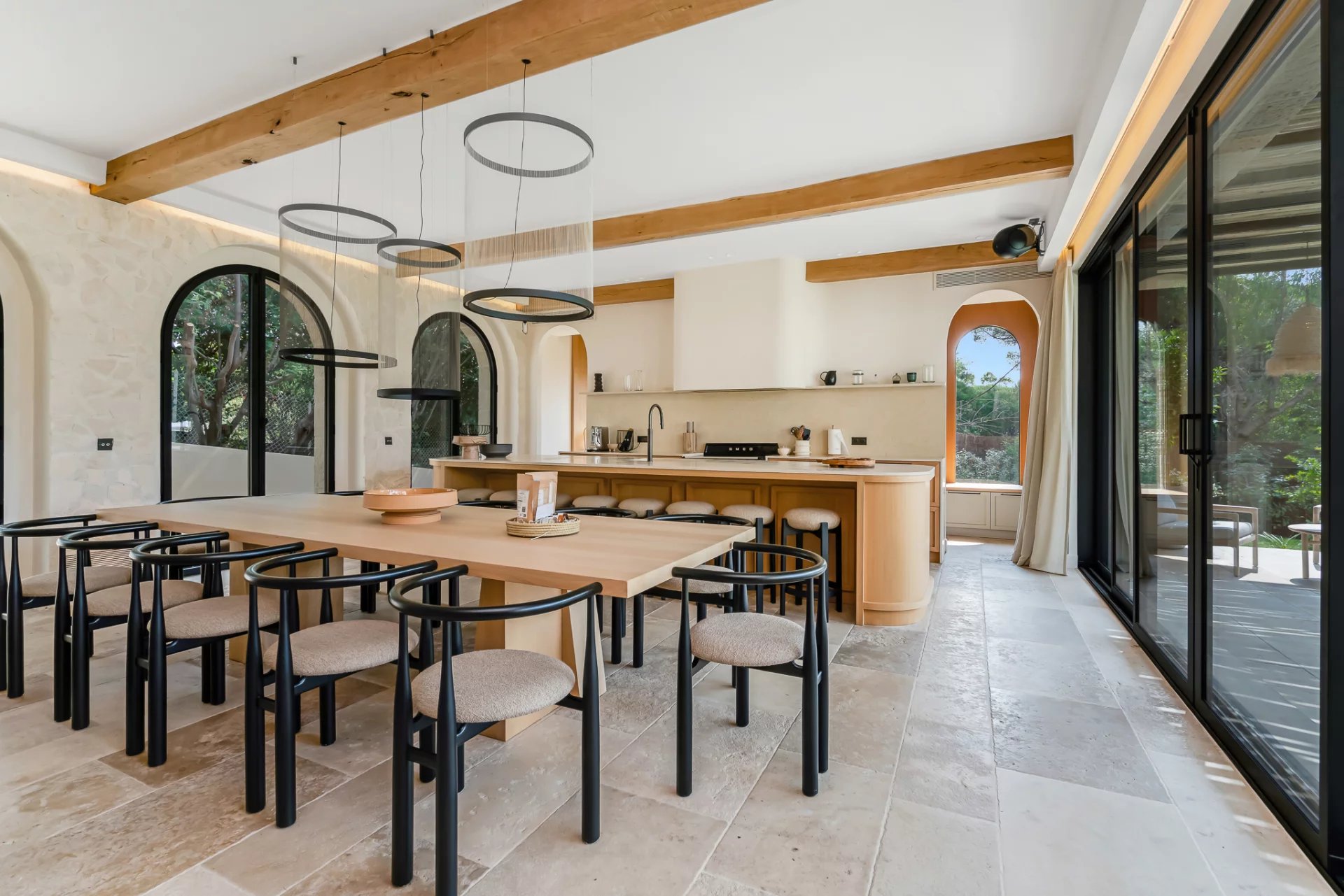 La villa possède un intérieur cosy et chaleureux, une cuisine entièrement équipée, une salle à manger, un séjour lumineux et ouvert sur l'extérieur,