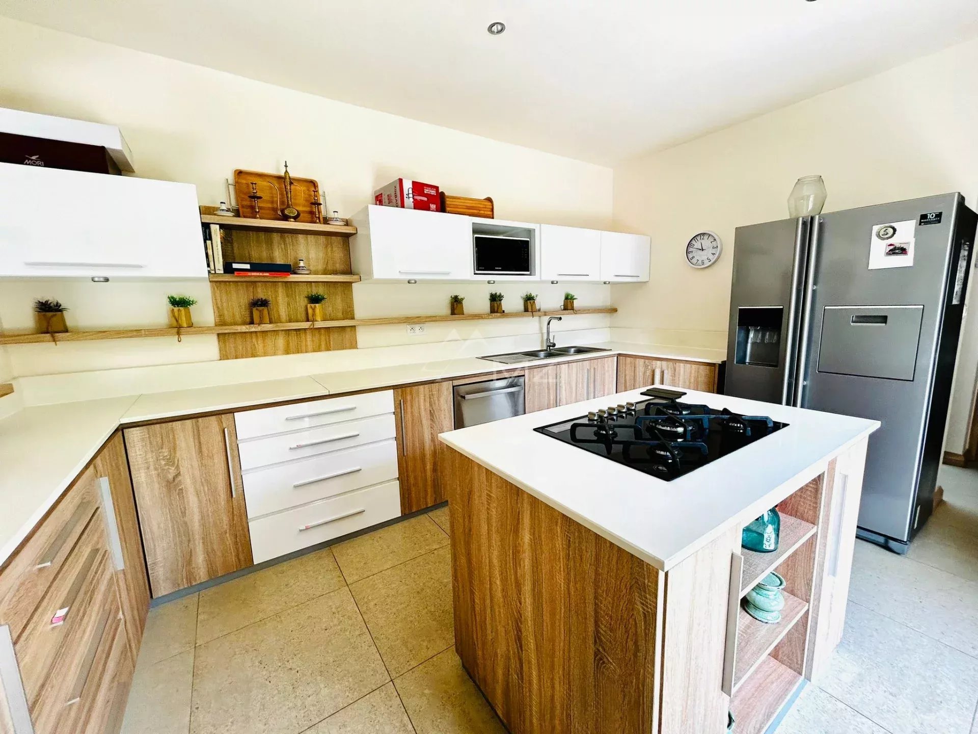 Érigée sur un terrain de 800 m2, avec une surface habitable de 414 m2, elle dispose également d'un coin bureau et d'une cuisine entièrement équipée.