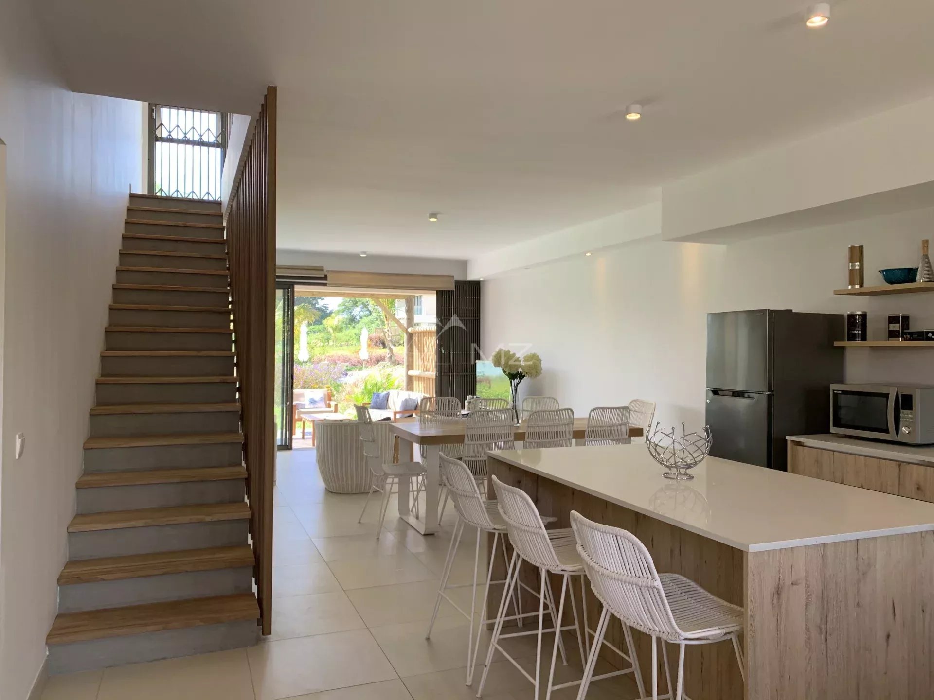 La cuisine américaine, équipée d'appareils haut de gamme tels qu'un réfrigérateur et un four, s'ouvre sur l'espace de vie lumineux donnant sur une varangue spacieuse.