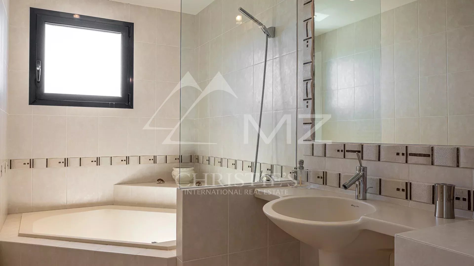 D’une surface habitable de 400 m² répartis sur deux niveaux, la villa propose des espaces lumineux et parfaitement agencés. Le premier étage comprend un vaste séjour baigné de lumière, une salle à manger, une cuisine américaine équipée ouvrant sur une grande terrasse aménagée, ainsi qu’un cellier, une salle TV et un bureau.
