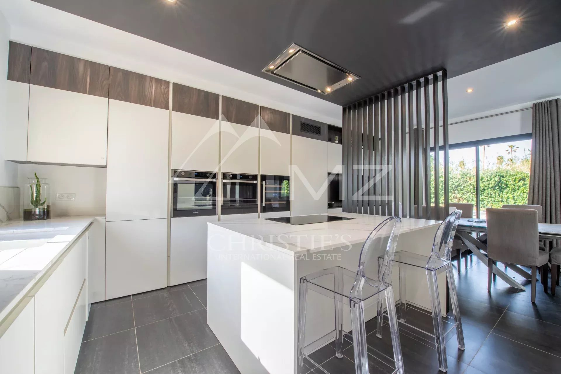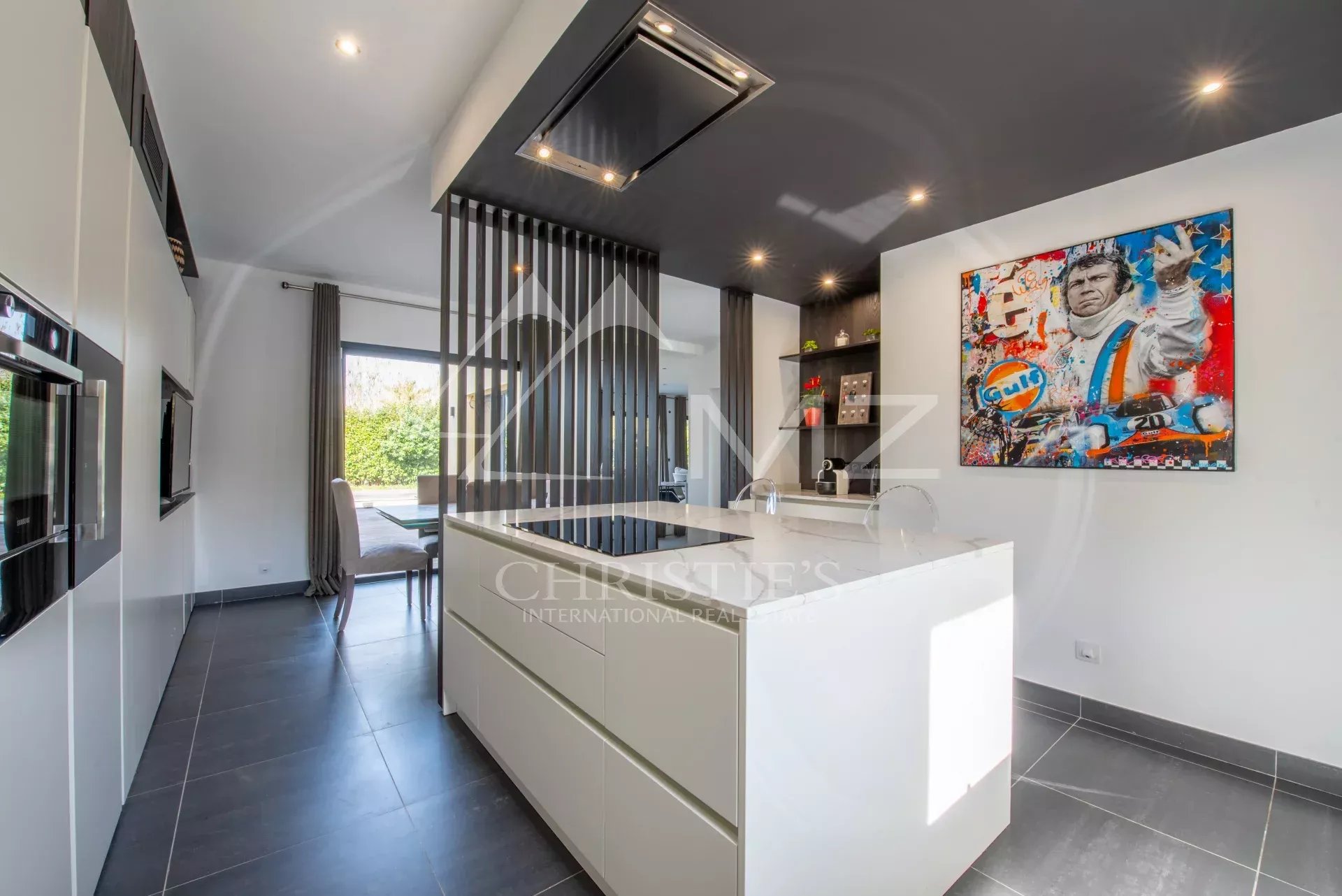 Cette villa moderne offre un intérieur lumineux sur 2 niveaux, une cuisine équipée, une salle à manger, un salon ouvert sur les terrasses ensoleillées, 4 chambres en suite avec leurs salles de douches, ainsi qu'un ascenseur.